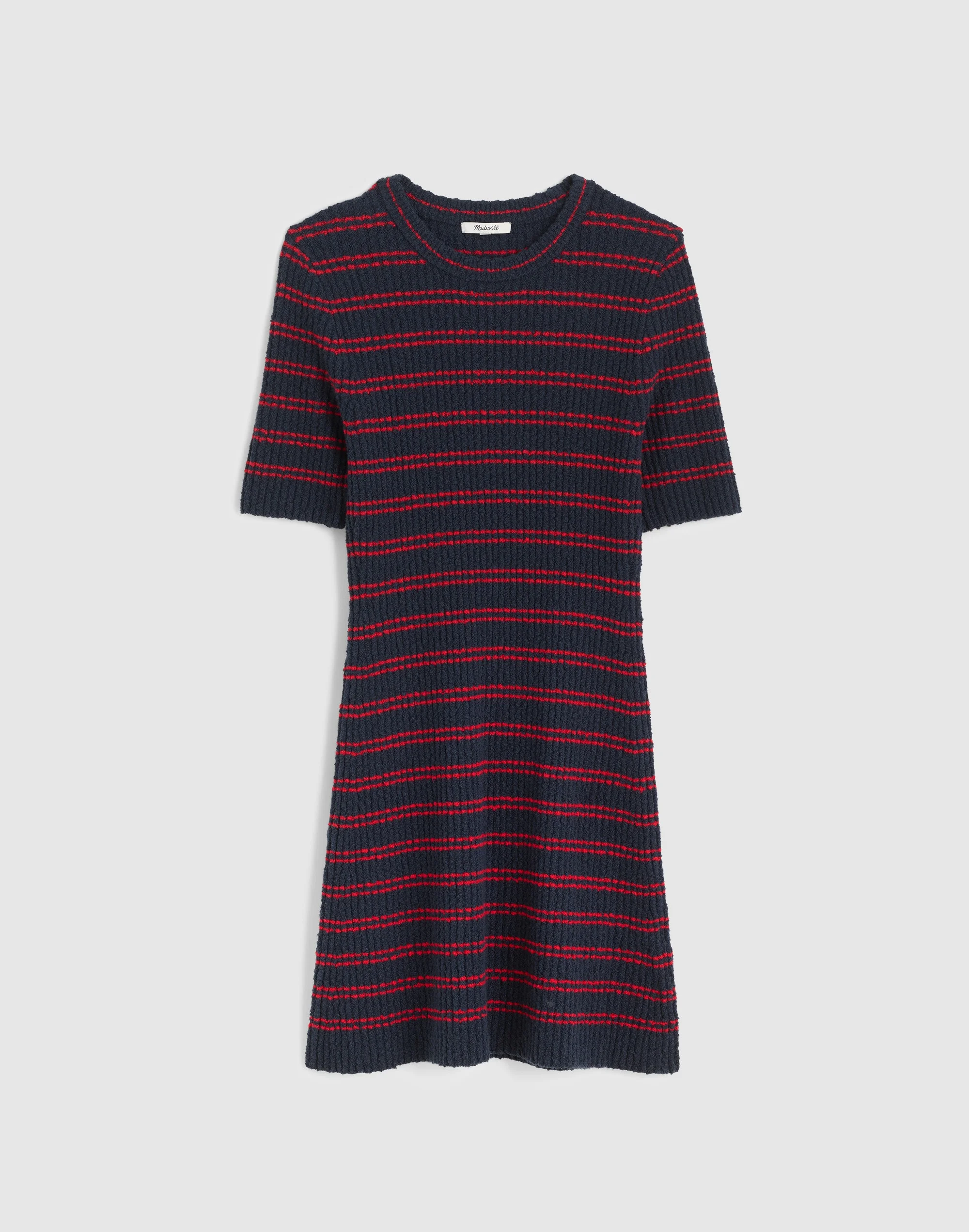 Crafted from textural cotton boucle yarn, this striped rib-knit mini dress features a crew neckline and flattering A-line fit. An easy transition piece to layer and pair with boots for a cozy look. - Regular fit. - Falls 35 1/2" from high point of shoulder (based on size M). - 84% cotton/14% polyamide/2% elastane. - Machine wash. - Imported. - Select stores. - Item NZ374