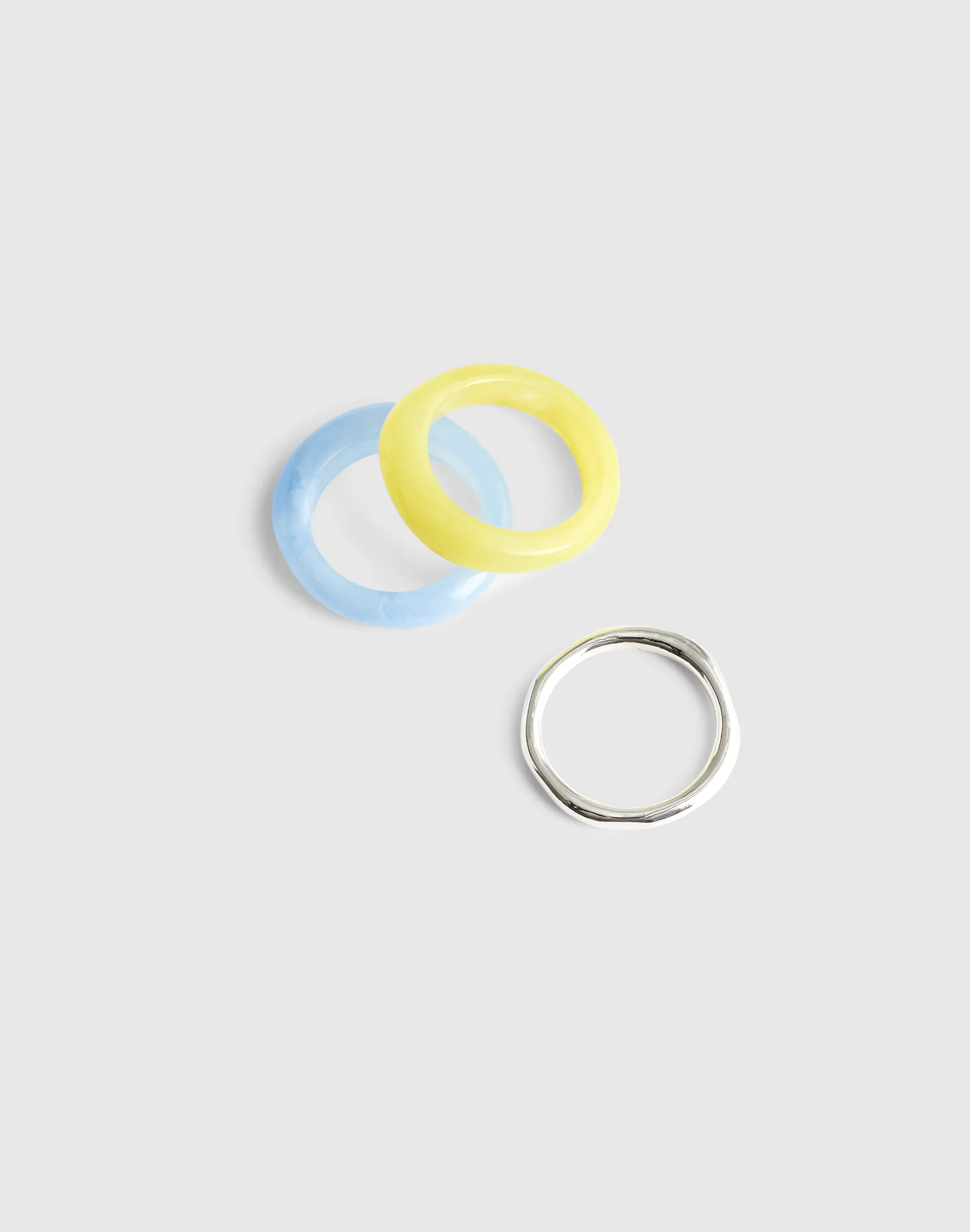 This playful mix of resin and metal rings come in a sculptural design. Stack them up or wear one at a time. - Plated brass, resin. - Nickel-safe. - Clean your jewelry after each wearing with a soft cloth. - Imported. - Item NZ892