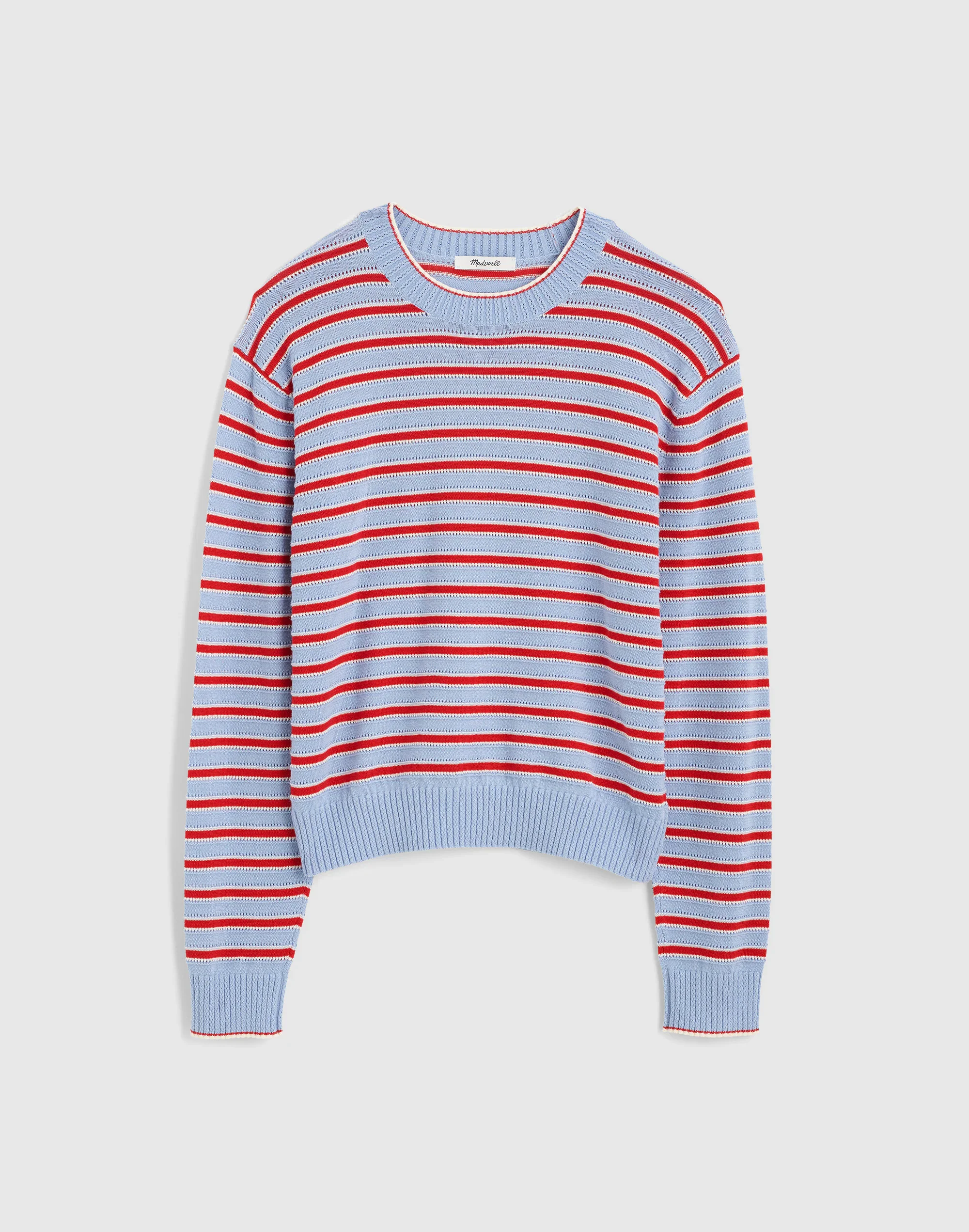 Coming in 100% cotton, this crewneck sweater features a textured, pointelle stitch and relaxed fit. With a classic stripe pattern, it's an essential piece you can layer under a favorite jacket. - Relaxed fit. - Length: designed to hit between the bellybutton and high hip. - Body length from high point of shoulder: 20 3/4". - 100% cotton. - Machine wash. - Imported. - Item NZ319