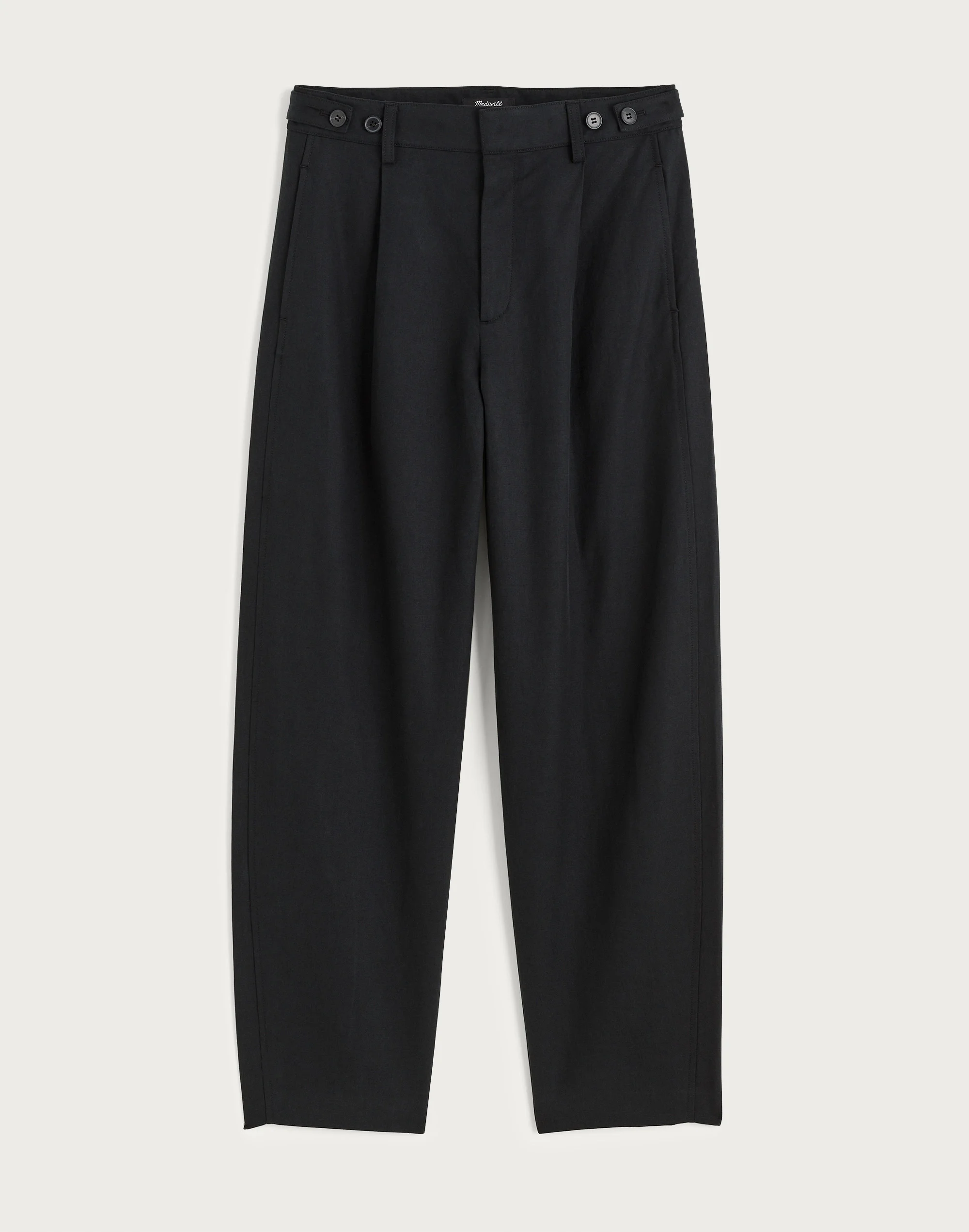 Crafted from TENCEL™ Lyocell-cotton blend twill, these high-rise pants feature a pleated barrel leg for an articulated, curved look with an ankle-grazing inseam. These are complete with trouser-like details like a hook-and-eye closure and slant front pockets. - 12 5/8" rise, 16 1/2" leg opening, 27" inseam. - 48% TENCEL™ Lyocell/33% cotton/19% linen. - Machine wash. - Imported. - Item OA012