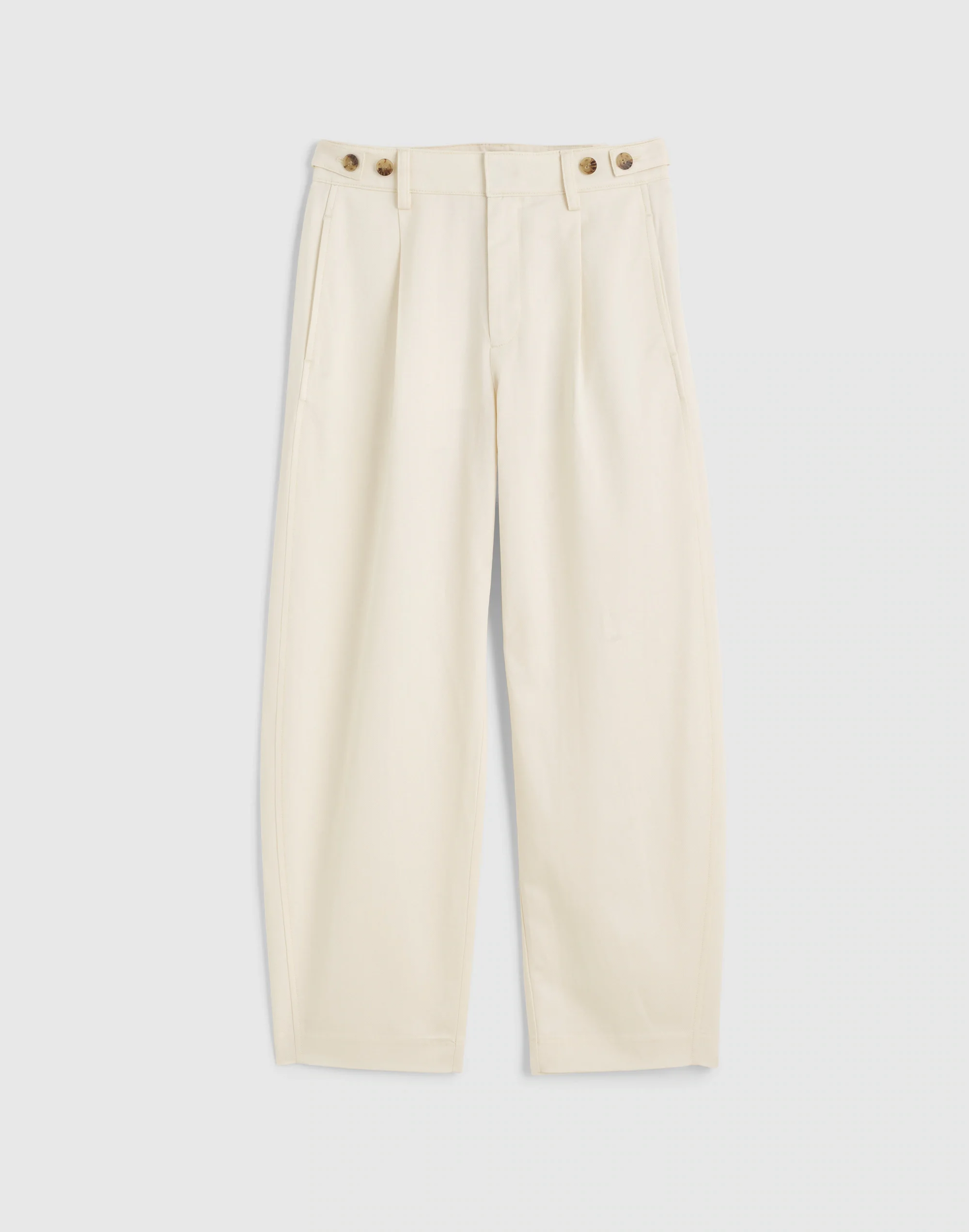 Crafted from TENCEL™ Lyocell-cotton blend twill, these high-rise pants feature a pleated barrel leg for an articulated, curved look with an ankle-grazing inseam. These are complete with trouser-like details like a hook-and-eye closure and slant front pockets. - 12 5/8" rise, 16 1/2" leg opening, 27" inseam. - 48% TENCEL™ Lyocell/33% cotton/19% linen. - Machine wash. - Imported. - Item OA016