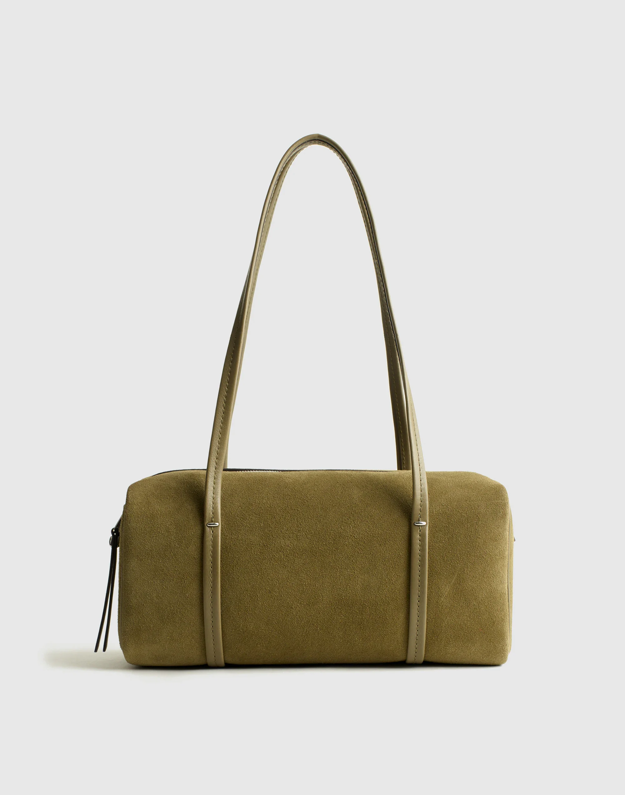 Coming in soft suede, this zip-top shoulder bag is designed with an elongated silhouette, trimmed with contrasting leather. Inside you'll find a lined interior with a patch pocket for keeping smaller items in check, as well as room for your phone, wallet, keys and lipstick. - 100% leather. - Lining: 100% cotton. - Do Well: leather sourced from a tannery that was certified by the Leather Working Group (LWG), an organization that works to promote sustainable environmental practices in the leather industry. - Zip closure. - Interior pocket. - 10 1/4" handle drop. - 5"H x 11 1/2"W. - Imported. - Select stores. - Item NZ753