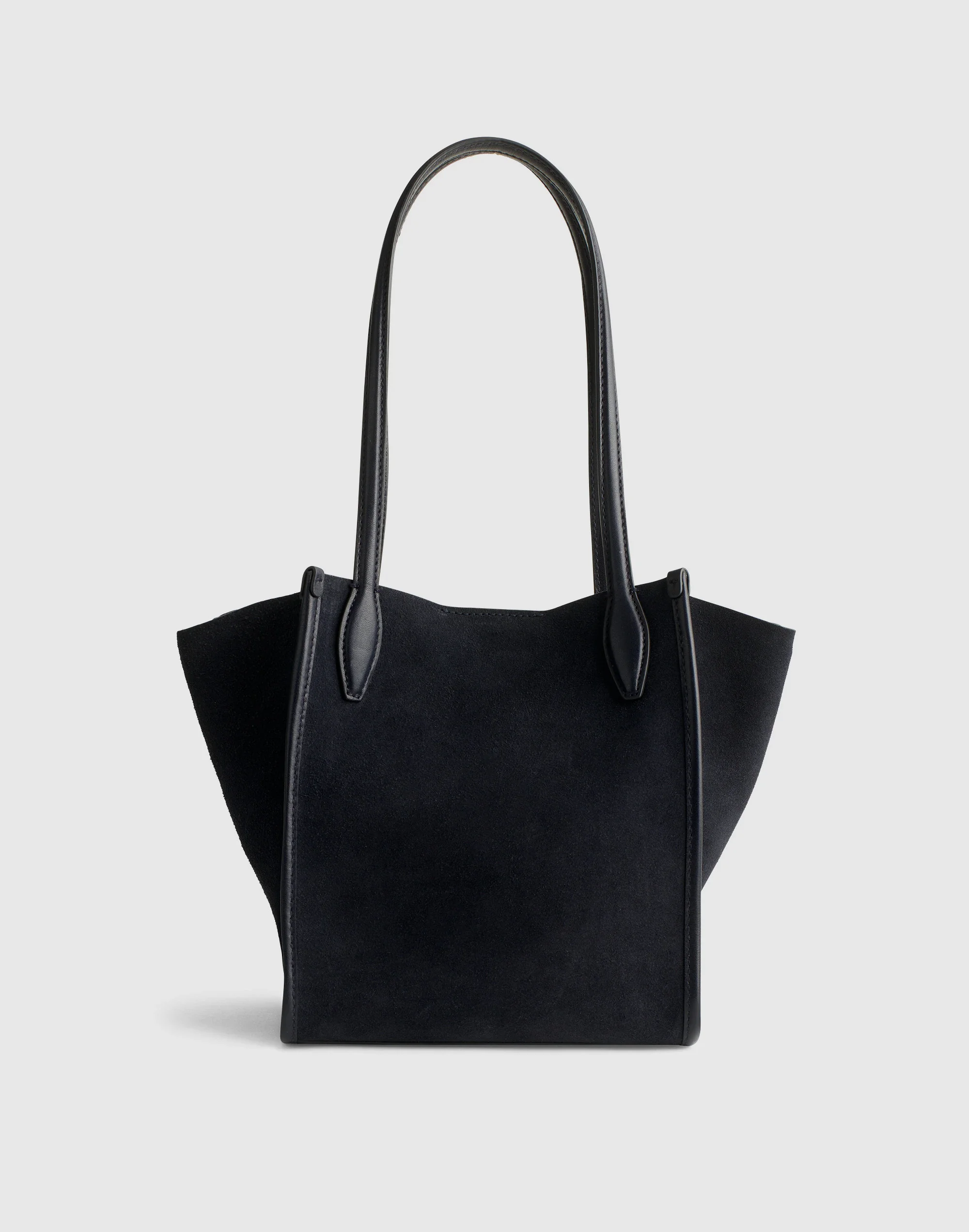 Coming in suede, this softly structured tote has collapsible sides that close with a dog clip that doubles as a key fob and a magnetic snap closure. It can hold a sunglasses case, phone, wallet and other essentials—plus, it has comfortable leather shoulder straps. - 100% leather. - Do Well: leather sourced from a tannery that was certified by the Leather Working Group (LWG), an organization that works to promote sustainable environmental practices in the leather industry. - Interior pocket. - 9 1/2" handle drop. - 1 3/10"H x 8 1/10"W. - Imported. - Select stores. - Item NZ759