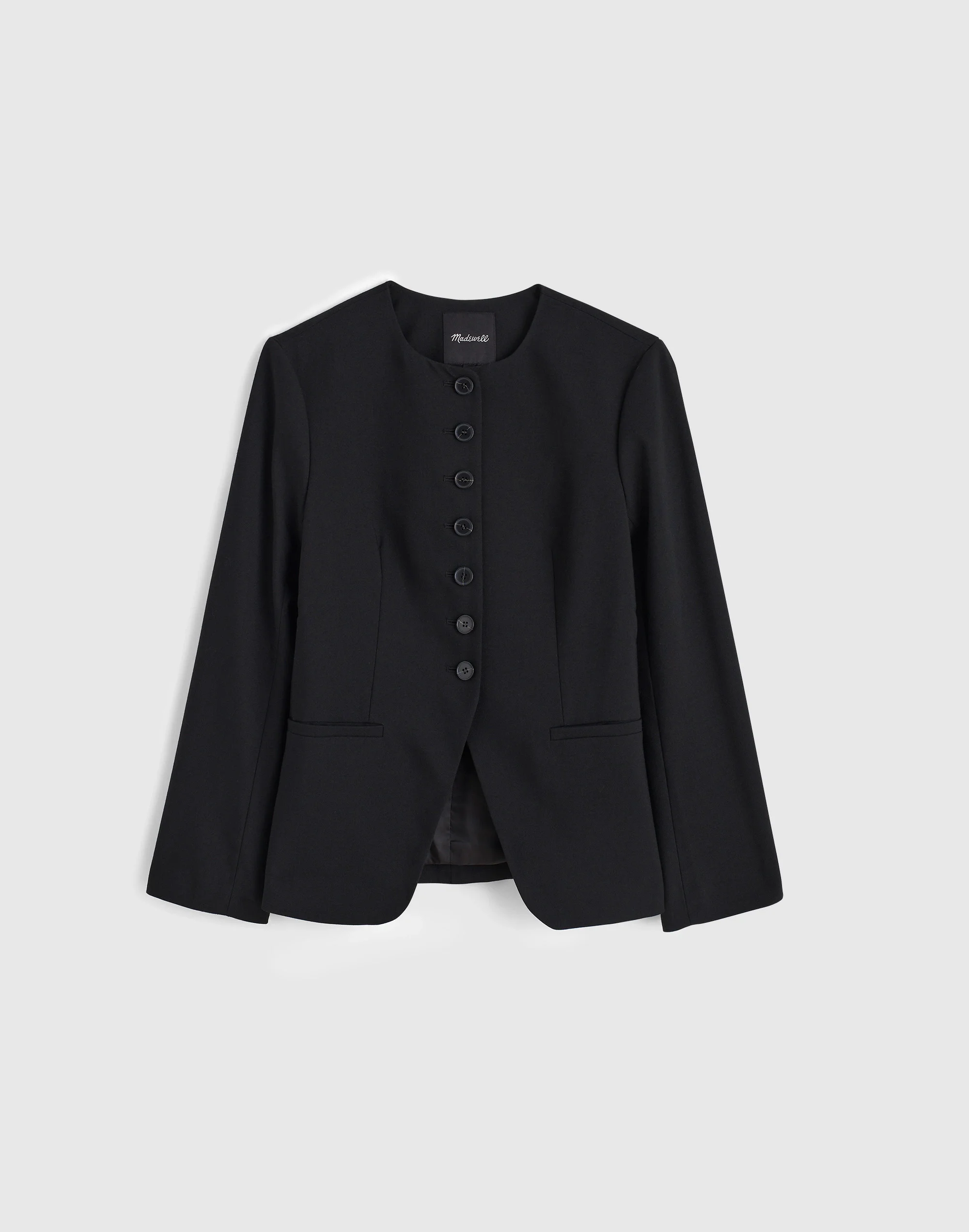 Modern yet timeless, this blazer has a sleek collarless design, fitted waist and cutaway hem. Finished with welt pockets and button-front closure, it's the kind of piece that adds quiet confidence to any look. - Regular fit. - Body length: 27 3/4". - 52% polyester/24% viscose/22% wool/2% other fibers. - Dry clean. - Imported. - Item NY408