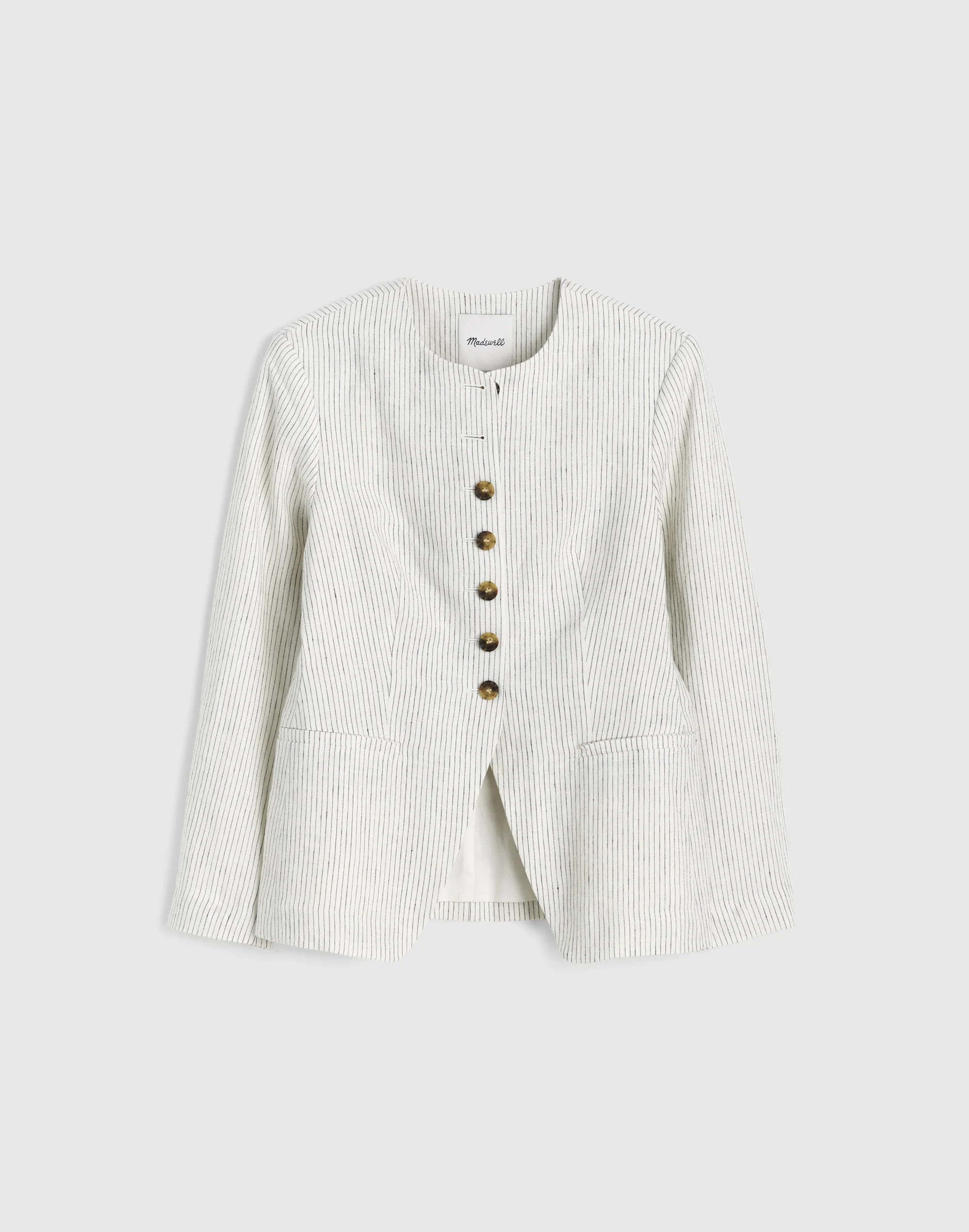 Modern yet timeless, this striped linen blazer has a sleek, collarless design, waisted fit and cutaway hem. Finished with welt pockets and a button-front closure, it's the kind of piece that adds quiet confidence to any look. - Regular fit. - Body length: 27". - 100% linen. - Dry clean. - Imported. - Item NZ518