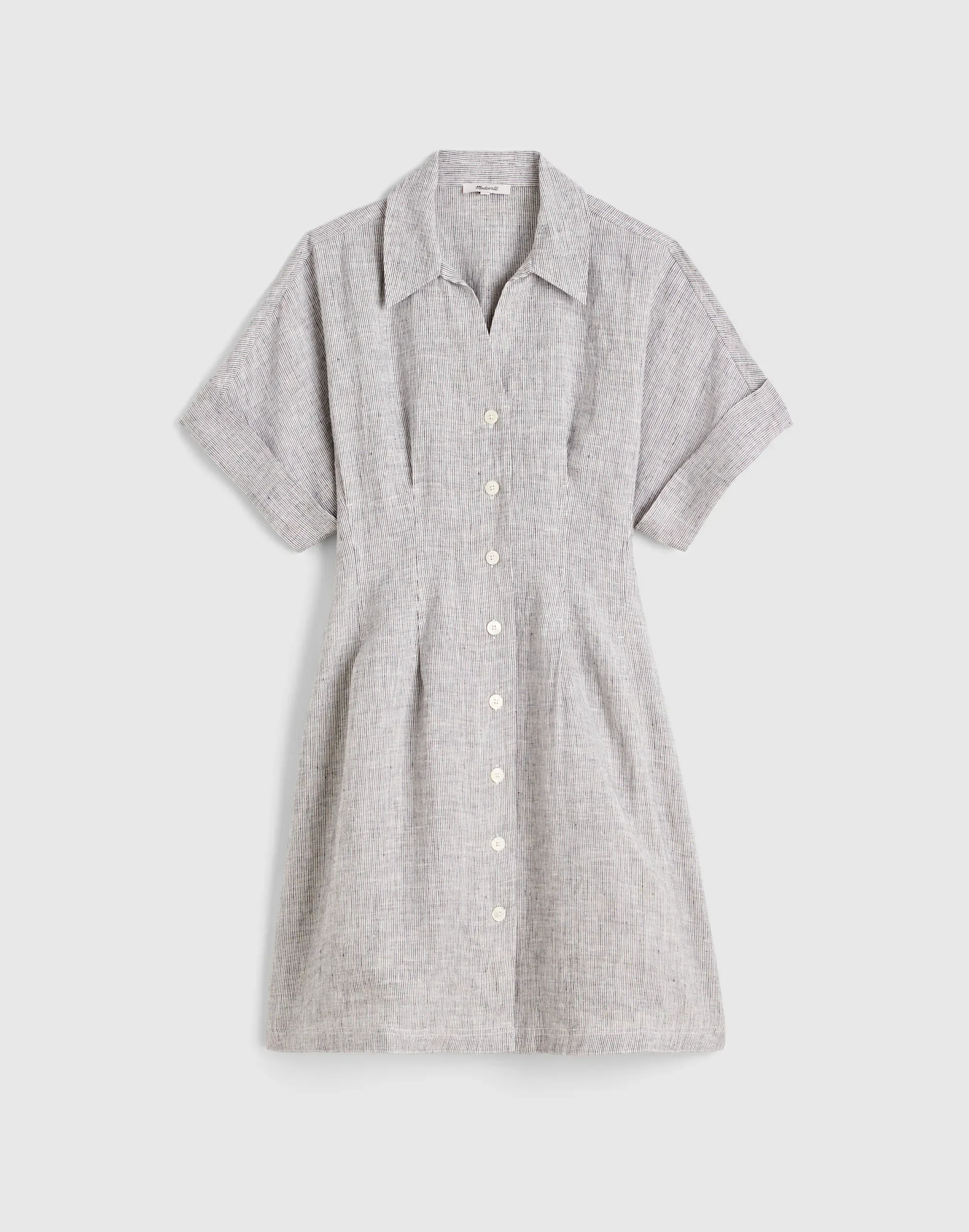 Effortlessly cool and timeless, this 100% linen mini shirtdress has a resort collar, cuffed short sleeves and buttons down the front for a classic look. The pleated details at the waist create a nipped skirt shape, offering a swingy fit. - Regular fit. - Falls 36 1/4" from high point of shoulder (based on size M). - 100% linen. - Machine wash. - Imported. - Select stores. - Item NZ410