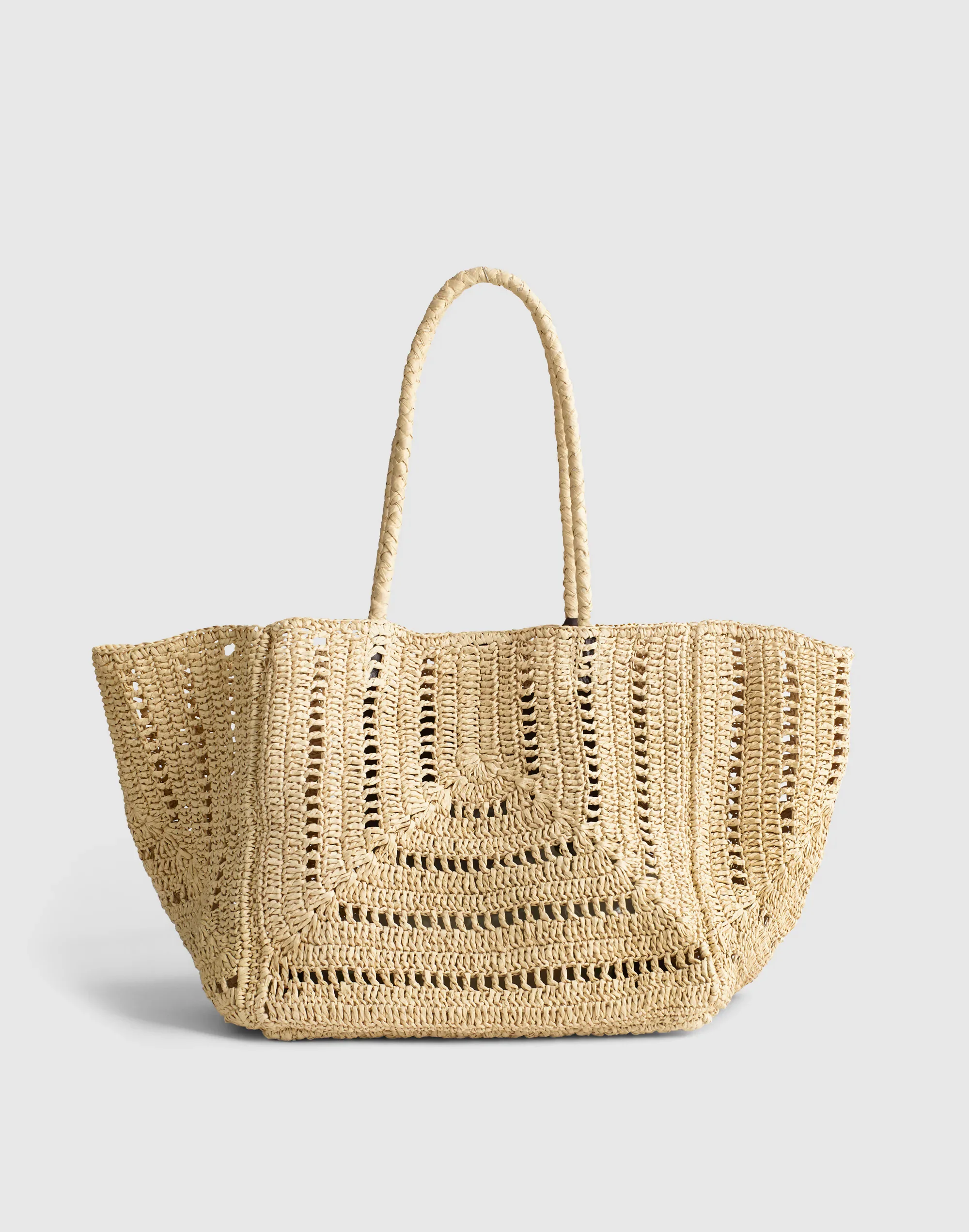 Woven from raffia with an eyelet pattern, this oversized tote combines a breezy seasonal feel with functional details like a magnetic tab closure and an interior hanging slip pocket for easy storage. Its spacious silhouette easily accommodates everything from your wallet to a book to a beach towel. - Raffia. - Magnetic closure. - Interior pocket. - 9 2/3" handle drop. - 13"H x 26 2/5"W. - Imported. - Select stores. - Item NZ906