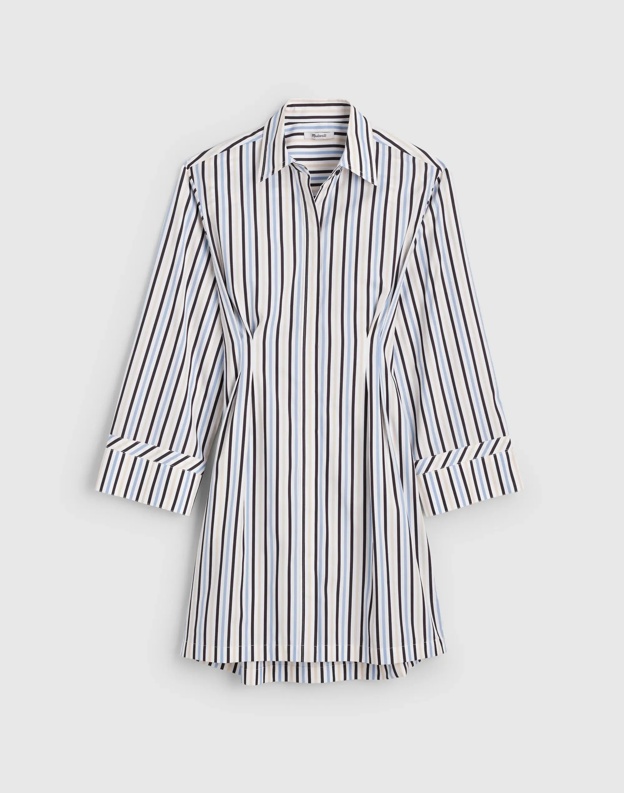 Crafted from 100% cotton poplin, this striped mini shirtdress features a classic point collar, convertible long sleeves and a concealed button placket down the front. Its finished with subtle tucks for definition at the waist. - Regular fit. - Falls 36 1/2" from high point of shoulder (based on size 6). - 100% cotton. - Machine wash. - Imported. - Select stores. - Item NZ439