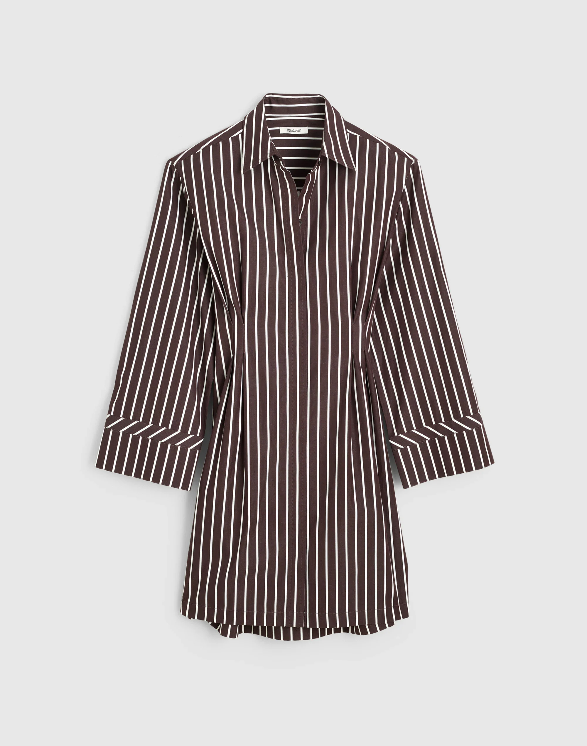 Crafted of 100% cotton poplin, this striped mini shirtdress features a classic point collar, convertible long sleeves and a concealed button placket down the front. It's finished with subtle tucks for definition at the waist. - Regular fit. - Falls 36" from high point of shoulder (based on size 6). - 100% cotton. - Machine wash. - Imported. - Select stores. - Item NZ436