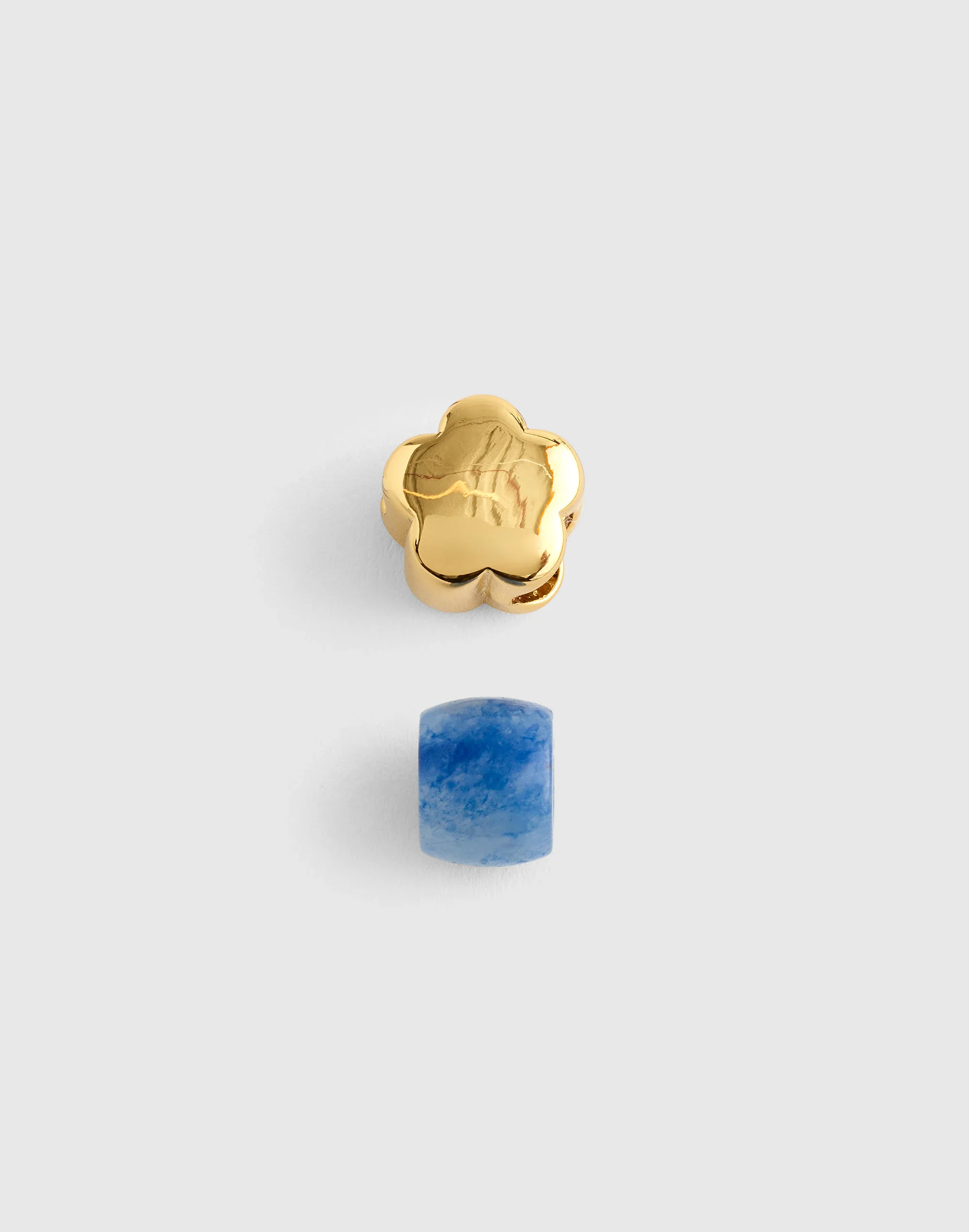 A set of two playful charms, one metal flower and a blue enamel bead, made to thread onto your shoelaces or add to one of our necklaces. - Plated brass, enamel. - Nickel-safe. - Clean your jewelry after each wearing with a soft cloth. - Imported. - Item NZ975