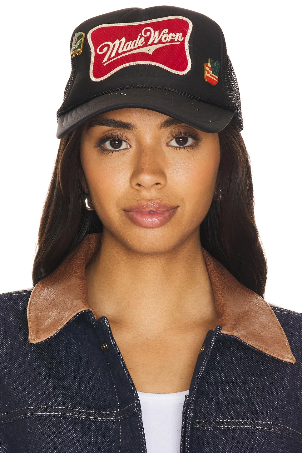 - 100% polyester - Made in China - Logo patch at front with detachable novelty enamel pins - Mesh and foam trucker hat with adjustable back strap - Brim measures approx 3.5" in length OS measures approx 26.69" in circumference - Revolve Style No. MDWR-WA2 - Manufacturer Style No. MWMW325HAT