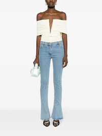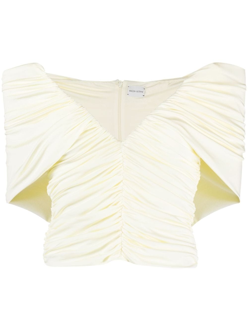 off-shoulder ruched top Highlights - Cream white - Stretch-jersey - Ruched bodice - Plunging v-neck - Off-shoulder - Draped panel detail - Sleeveless - Concealed rear zip fastening - Fitted waistline - Cropped Imported Composition Viscose 95%, Elastane 5% SIZE & FIT Model measurements Height 5 ft 11 in(1.81 m) Bust/Chest 32.67 in(83 cm) Hips 35.43 in(90 cm) Waist 23.62 in(60 cm) FittingInformation Designed for a slim fit that sits just away from the body offering a close yet comfortable fit Made from a midweight stretch fabric, this piece offers elasticity and flexibility when worn This piece fits true to size – take your usual size