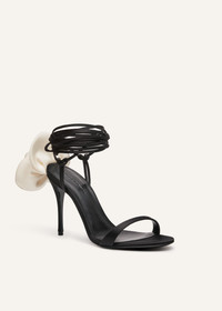 A strappy sandal with a 105mm heel and long strappy ankle ties is adorned with two 3D flowers: one detachable flower at the front and a fixed flower at the heel. Details ID: 522423 Upper; Satin (Viscose 72%, Silk 28%). Insole; Calf Leather, Sole; Leather. Sizing This piece fits true to size. We recommend you get your regular size.
