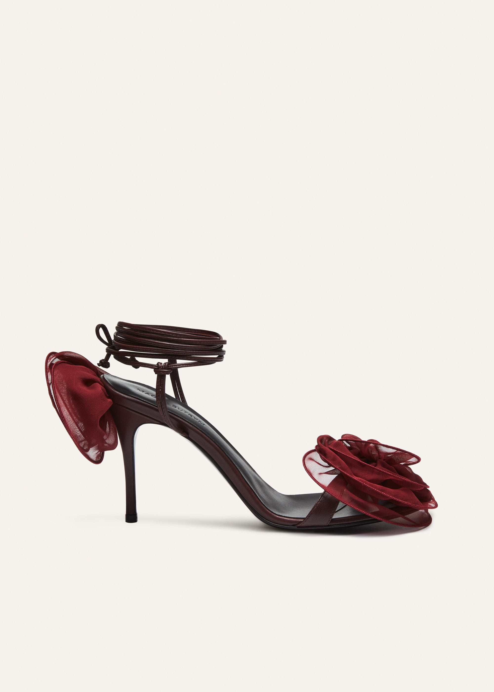 Burgundy strappy sandals with a 90mm heel, ankle ties, and dual 3D flowers. Details ID: 529425 Upper: 100% Nappa Leather. Insole, Sole: 100% Calf Leather Sizing This piece fits true to size. We recommend you get your regular size.