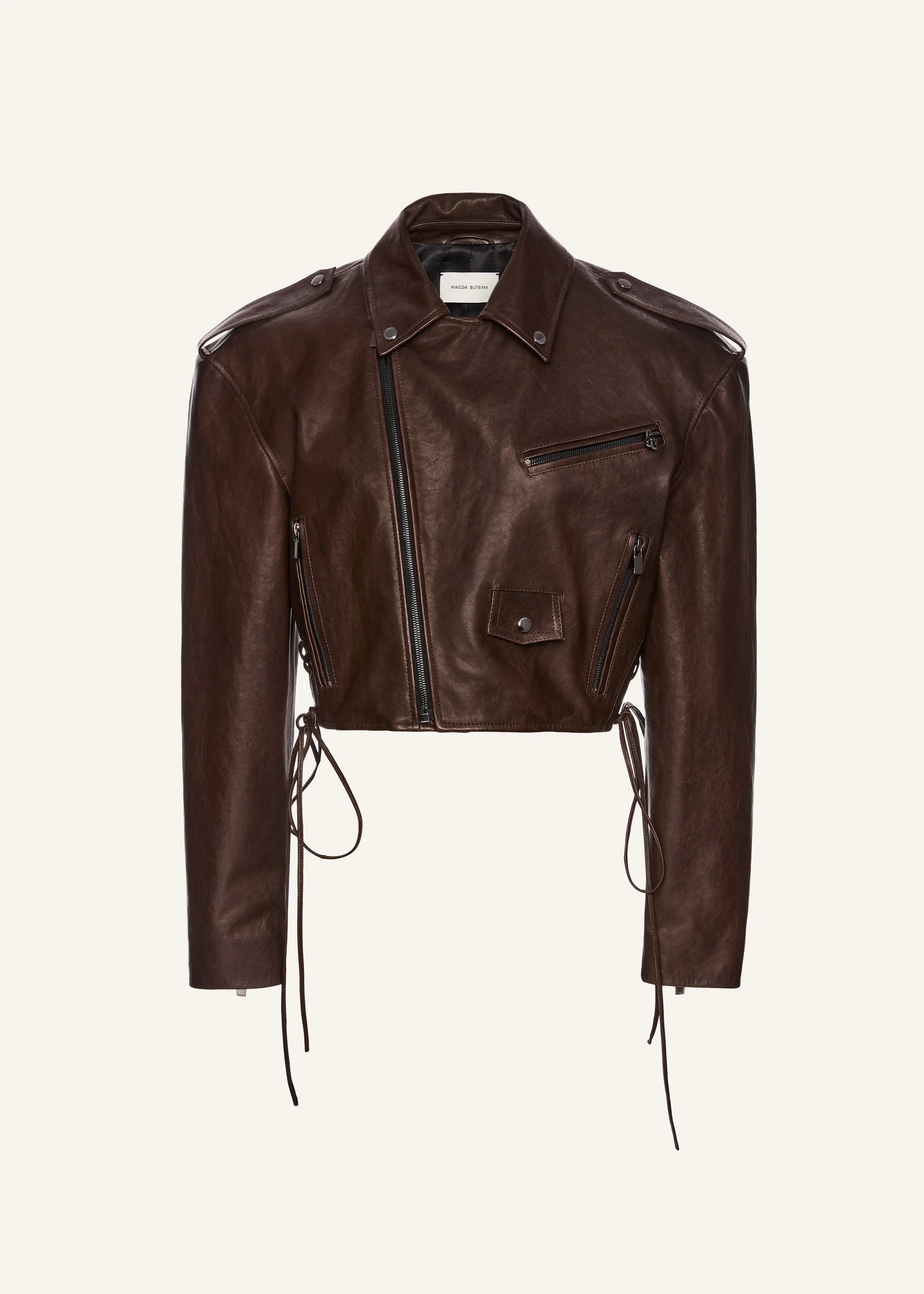 Magda Butrym's iconic brown biker jacket is available this season in a distressed brown, with classic moto detailing such as cross ties and silver hardware, with an oversized fit. Details ID: 297725 Shell 100% Sheep Leather. Lining 100% Viscose. Sizing This piece fits true to size. We recommend you get your regular size. Model is 180 cm and is wearing a size 34.