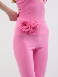 MAGDA BUTRYM pants in pink, 3D flower detailing, stretch jersey, mid-elastic waist, cropped, fitted. Made in Poland Italian Sizing 85% Viscose, 15% Elastane Model is 5'9" wearing size 36. Bust: 31.5" Waist: 23" Hips: 34"