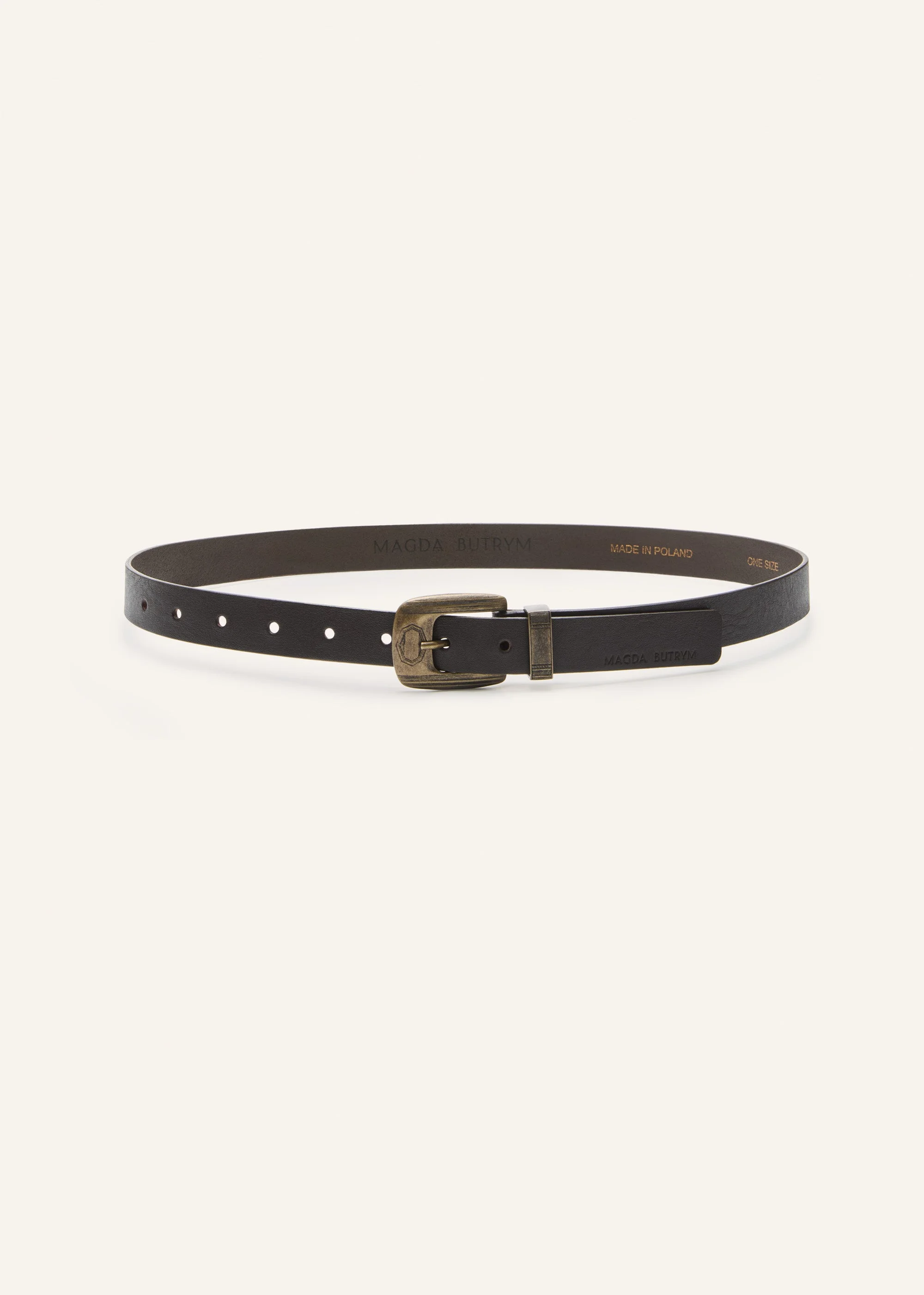 Leather belt featuring a rectangular buckle and loop in antique-effect brass. Clean lines meet vintage hardware in a minimal, Western-inspired silhouette. Details ID: 402925 Shell 100% Cow Leather. Sizing Approximate measurements: 2,5cm width, 76cm to 91cm length
