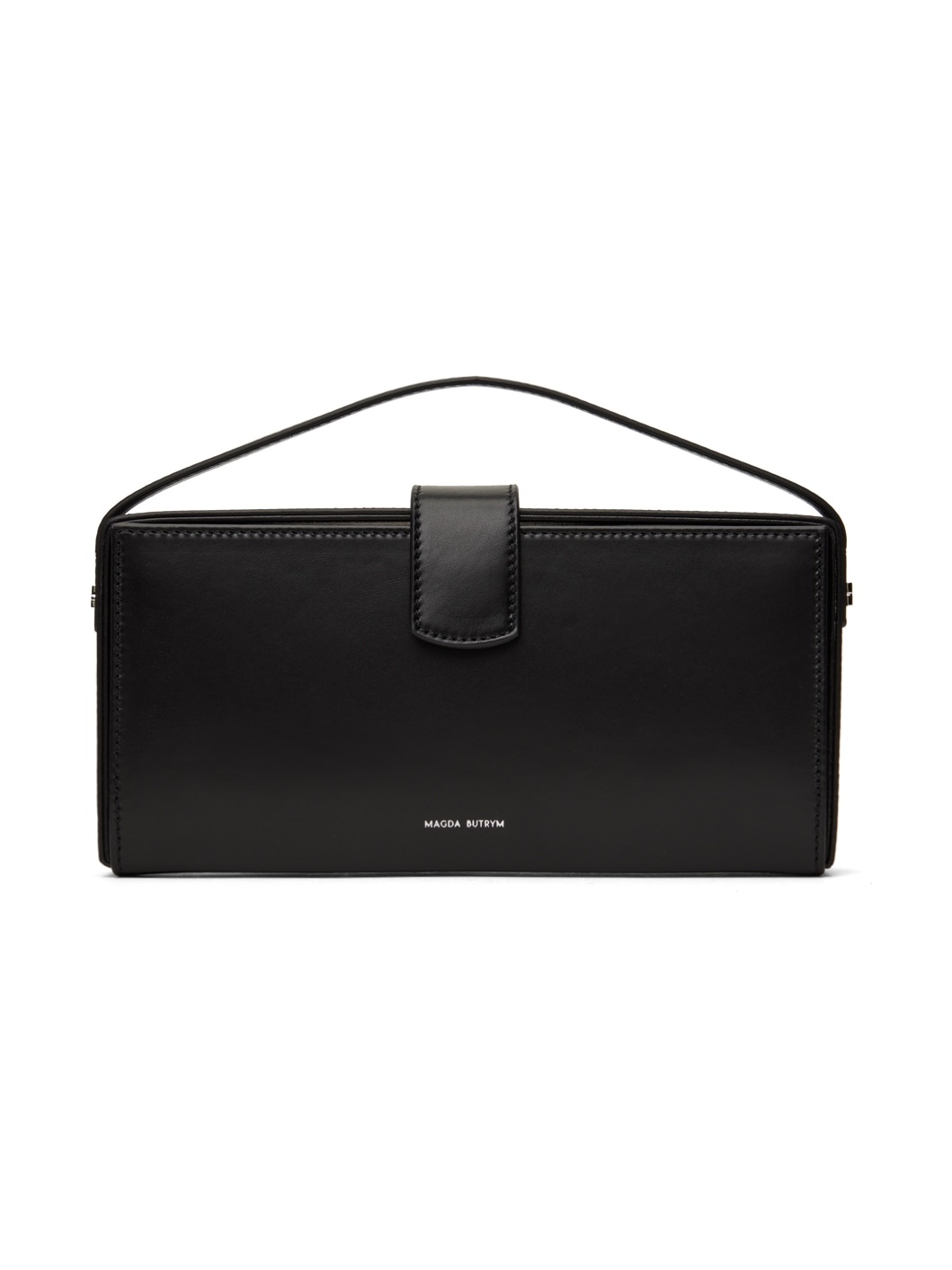 Structured buffed calfskin clutch in black. · Fixed carry handle · Logo stamp at face · Logo hardware at side · Magnetic flap closure · Card slot at interior · Floral graphic printed at calfskin interior · H4.5" x W9.5" x D2" Supplier color: Black