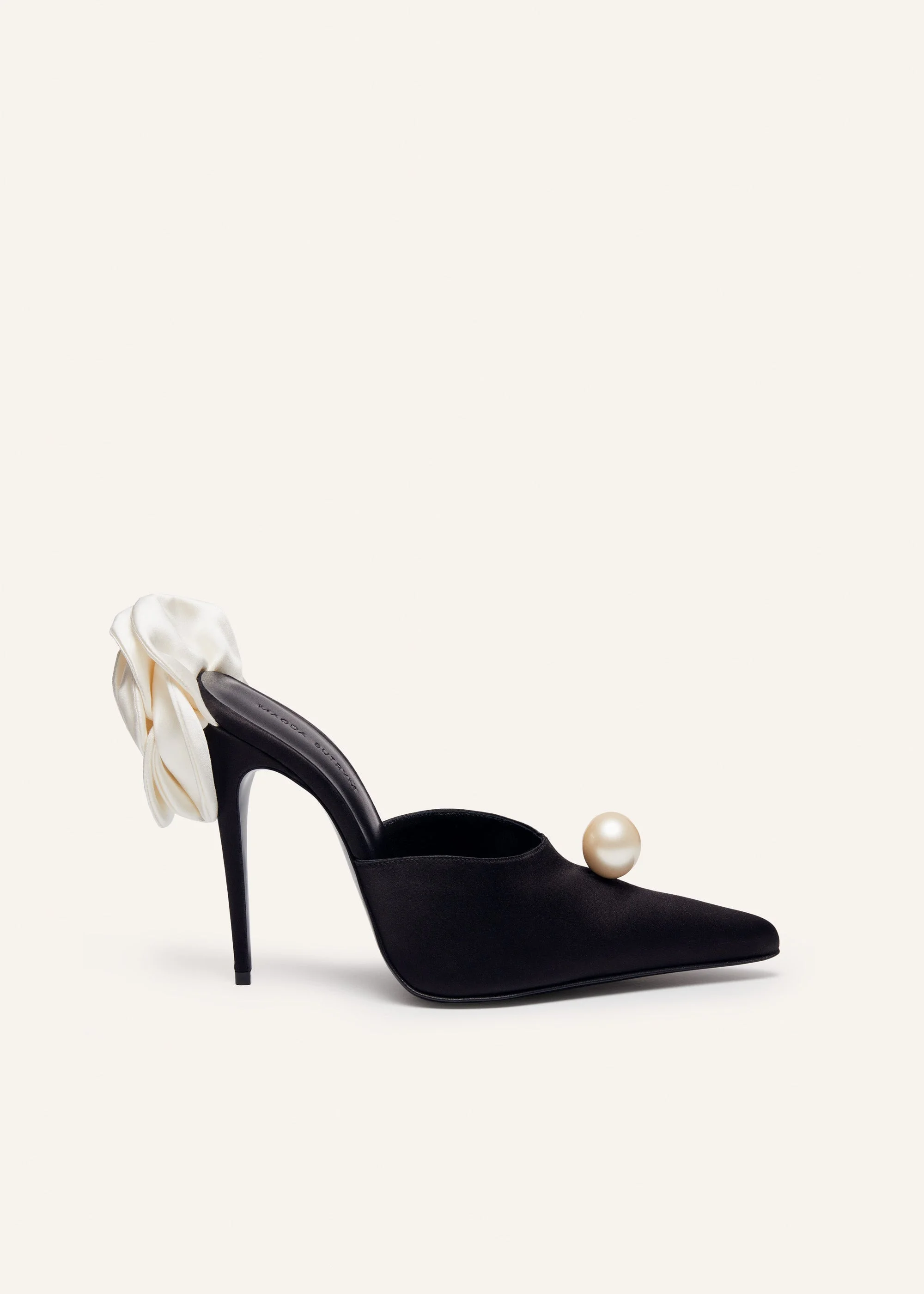 Made in Italy, these pointed toe mules are set atop a 110mm heel and feature Magda's signature 3D flower at the heel. As an extra detail, a large faux pearl adorns the front. Details ID: 531723 Upper: 72% Viscose 28% Silk. Insole. Sole: 100% Calf Leather. Flower 100% Silk. Sizing This piece fits true to size. We recommend you get your regular size.