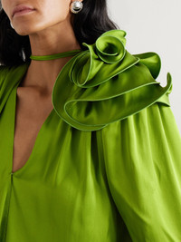 Magda Butrym's blouse is designed with a flower applique that can easily be detached for a more pared-back look - the detail is a true calling card of the brand. It's made from lustrous bright-green silk-satin and has removable padding underpinning the gathered shoulders.