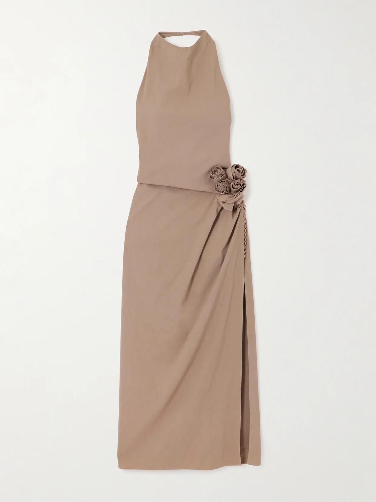 Magda Butrym's modernist take on feminine dressing is both romantic and confidence-inducing. This linen-blend maxi dress is detailed with a halter neckline and bouquet of signature floral appliques at the hip. The dramatic split reveals a flash of leg as you walk.