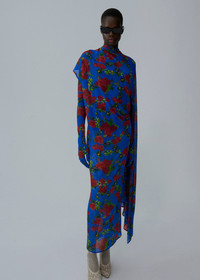 Crafted in a sheer floral print and designed with an asymmetric silhouette. Draped from the left shoulder, a long flowing scarf cascades dramatically down the body. The neckline features a soft cowl at the front, while the back reveals a deep, open decolletage finished with a delicately ruched collar. A built-in bodysuit, attached along the back neckline with thin straps, ensures a secure fit. Details ID: 267925 Shell 92% Cupro 8% Elastane Sizing This piece fits true to size. We recommend you get your regular size. Model is 177 cm and is wearing a size 34.