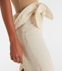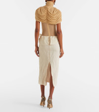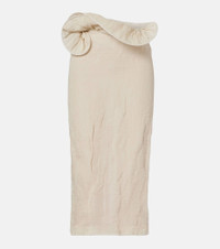 Magda Butrym aims to empower with sharp modern style, expertly delivered through artisanal excellence. This midi skirt is a lightweight piece with a distinct, structured waistline with an asymmetric design. Product Details - Material: 36% lyocell, 33% cotton, 30% polyester, 1% elastane - Care instructions: dry clean - Made in Poland - Color: white - Designer color name: Cream - Lining: 100% silk - Closure: concealed zipped back - Item number: P01130910 Size & Fit - True to size - Close fit at the hips - Non-stretchy fabric - High-waisted - slit length 36,0cm-14" - The model seen in the picture is 178cm-5'10" and wearing a size FR 36
