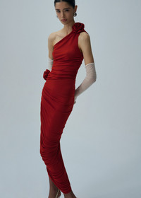 Asymmetrical draped midi skirt in red
