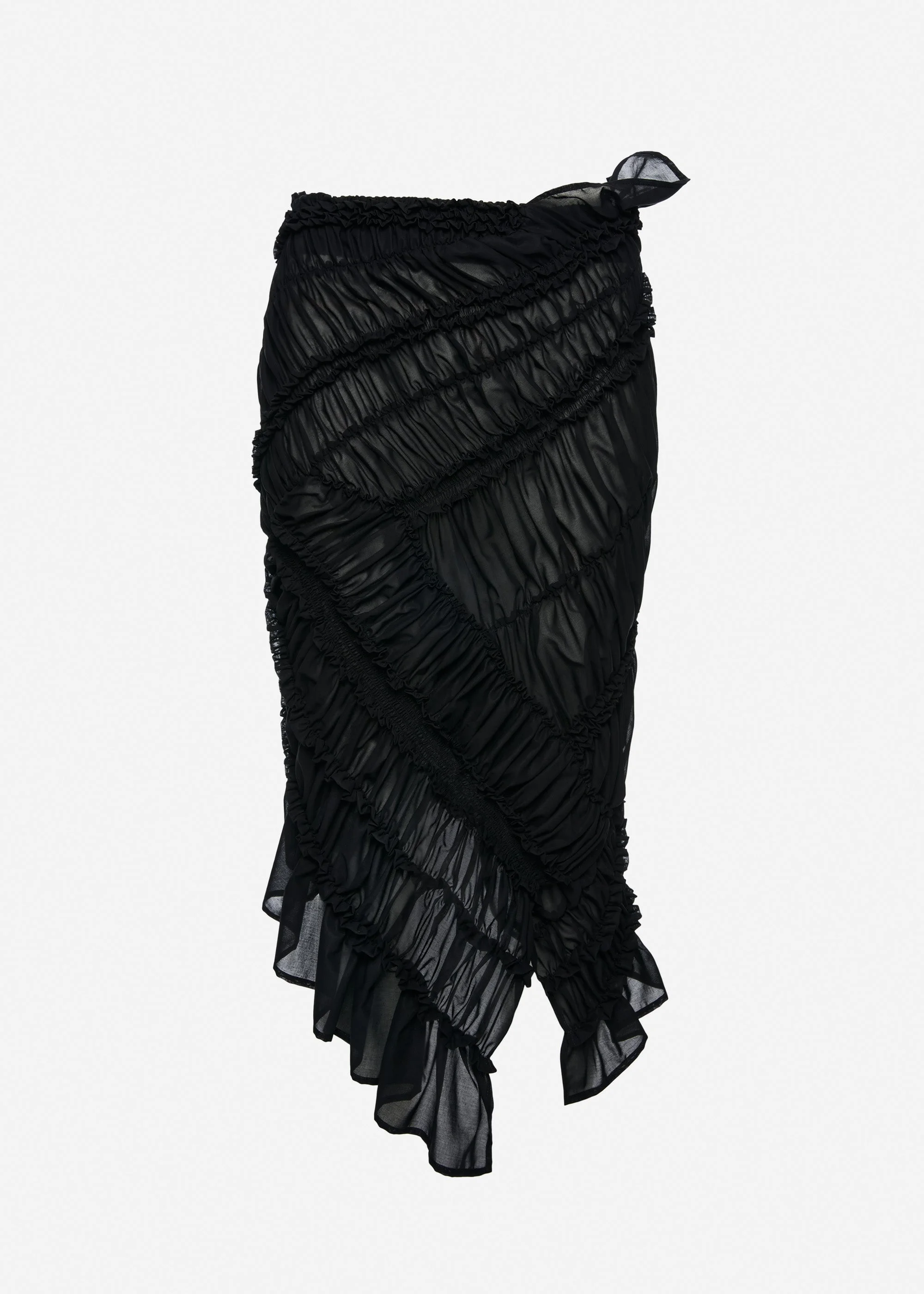 A knee-length skirt crafted entirely from softly ruched panels, creating a sculptural, body-skimming silhouette. Designed with an elasticated waistband, it features an asymmetric hem. A striking piece that balances romantic texture with a refined, contemporary edge. Details ID: 102526 Shell 100% Cotton Sizing This piece has a regular fit. Model is wearing a size 34.