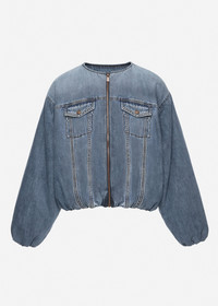 A contemporary take on the classic denim jacket, featuring a voluminous, rounded silhouette with a gathered hem. The design is defined by its dropped shoulders, balloon sleeves, and a front zip closure that adds a modern edge. Details ID: 155426 Shell 100% Cotton. Sizing This piece has an oversized fit. Model is wearing a size 34.