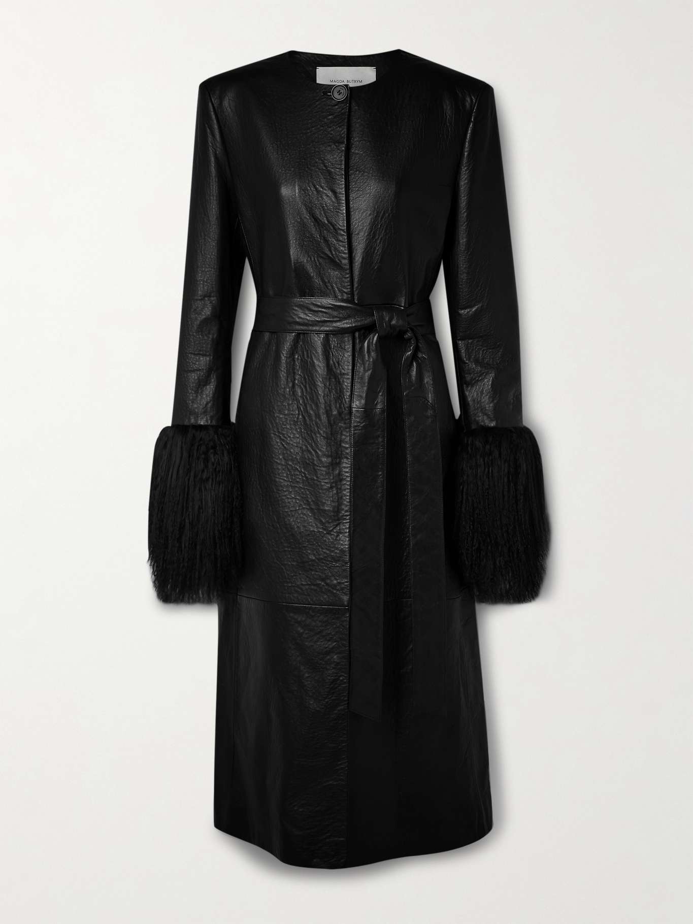 Undeniably sophisticated, Magda Butrym's coat is an effortless way to make winter looks feel more elevated. It's made from supple textured-leather and has wispy faux fur trims at the cuffs. The shoulders are lightly padded and the coordinating belt cinches the shapes. Size & Fit - Fits true to size, take your normal size - Designed for a slightly loose fit, use the tie belt to cinch in at the waist - Supple, non-stretchy leather - Model is 177cm/ 5'10" and is wearing a FR 36 Model measurements: - Bust: 80cm/ 32" - Waist: 61cm/ 24" - Hip: 86cm/ 34" Details & Care - Black textured-leather and faux fur - Partially concealed button fastenings through front - 100% leather (Sheep) - Specialist clean