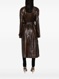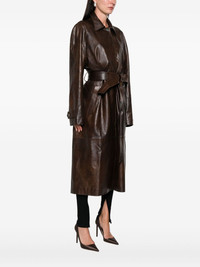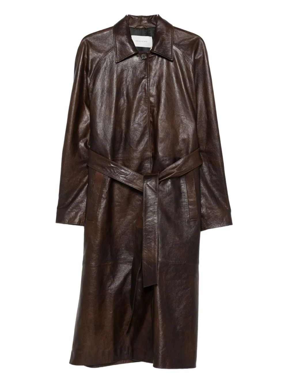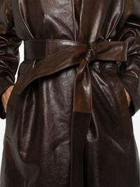 belted leather coat Highlights - Brown - Leather - Belted waist - Long sleeves Imported Composition Lining: Viscose 100% Outer: Sheepskin 100% SIZE & FIT Model measurements Height 5 ft 10 in(1.78 m) Bust/Chest 33.46 in(85 cm) Hips 36.22 in(92 cm) Waist 23.22 in(59 cm) Washing instructions Specialist Cleaning