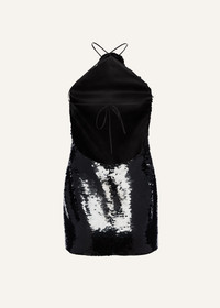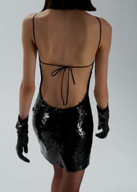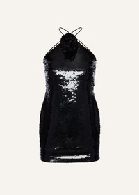 Black sequin mini dress with a choker neckline, open back, and a single floral accent at the neck. Details ID: 221425 Shell 100% Polyester. Lining 100% Silk. Sizing This piece fits true to size. We recommend you get your regular size. Model is 180 cm and is wearing a size 34.