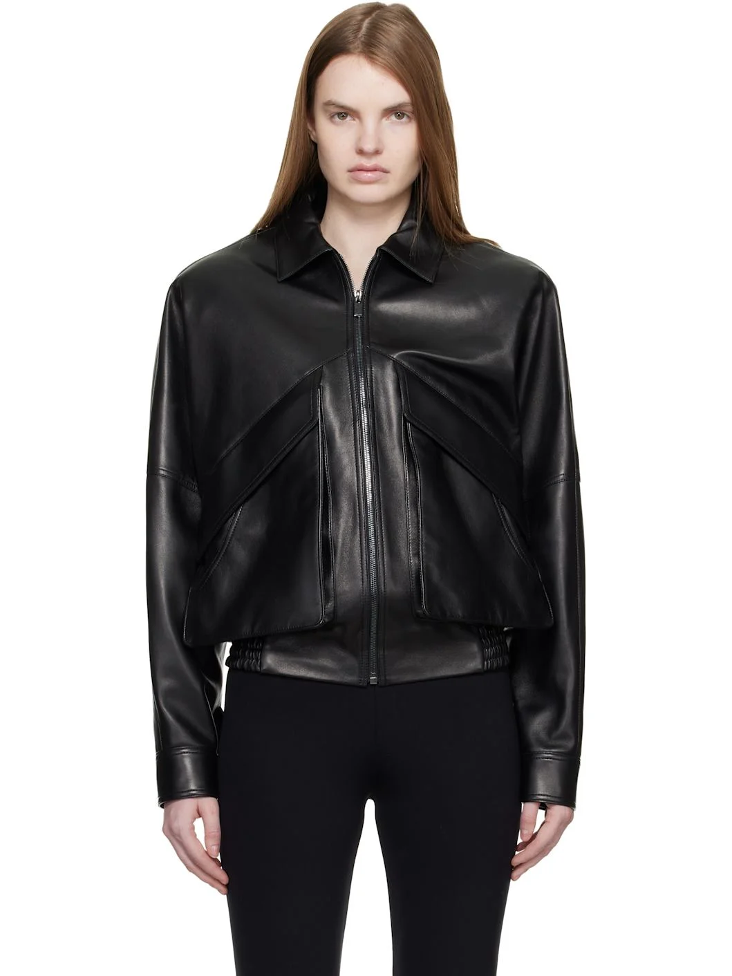 Grained sheepskin bomber jacket. · Spread collar · Zip closure · Bellows pockets and patch pockets at waist · Elasticized hem · Padded dropped shoulders · Press-stud barrel cuffs · Welt pocket at interior · Full viscose twill lining Supplier color: Black Body: 100% sheepskin. Lining: 100% viscose. Made in Poland 252533F064006