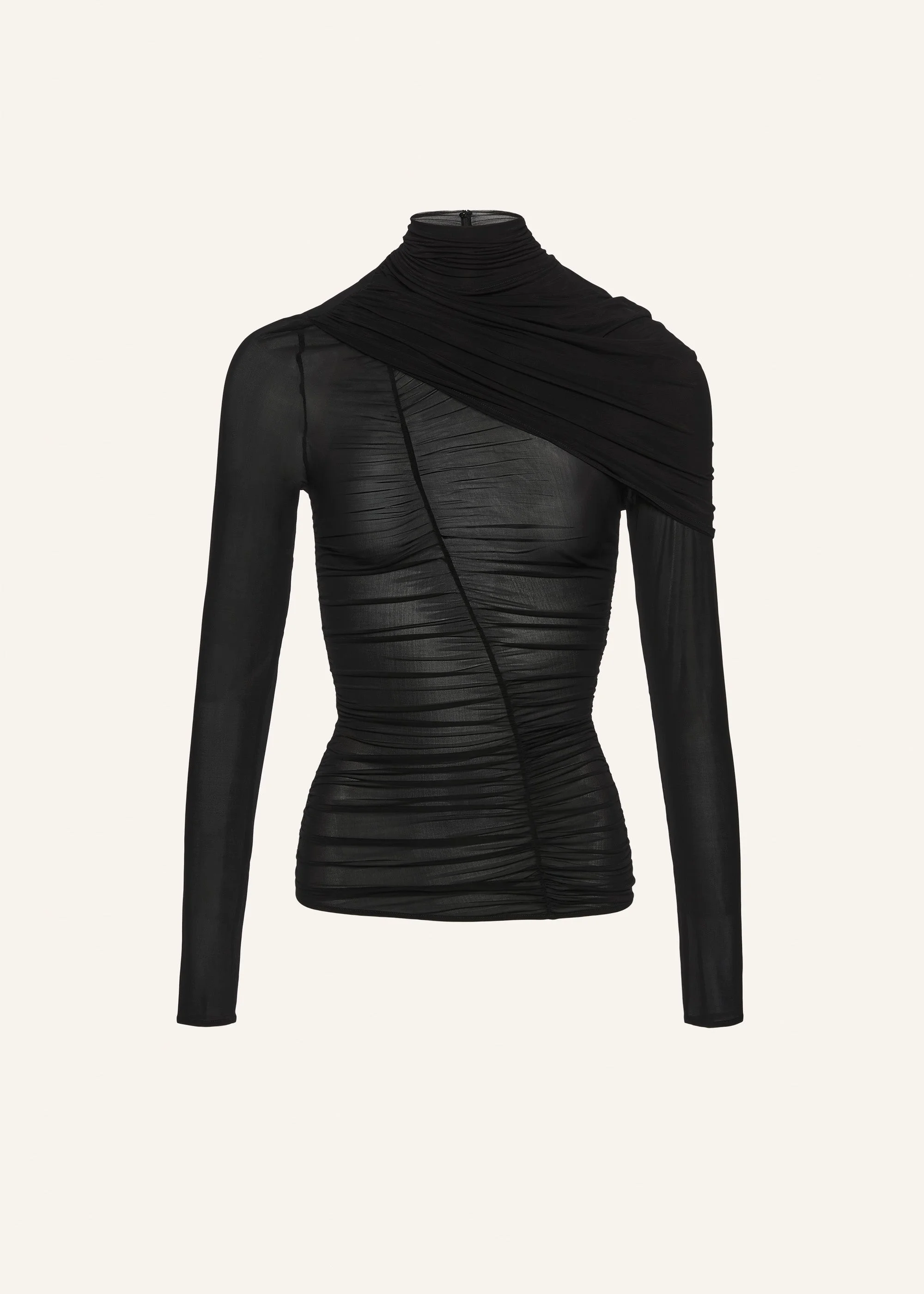 A fitted long-sleeve top crafted from lightweight cupro mesh, featuring diagonal ruching across the front and sides for a sculpted silhouette. A high ruched collar and an asymmetric sheer cape overlay that drapes from the left shoulder to the right. Closes with a concealed zip at the center back. Details ID: 261925 Shell 92% Cupro 8% Elastane. Sizing This piece fits true to size. We recommend you get your regular size. Model is 177 cm and is wearing a size 34.