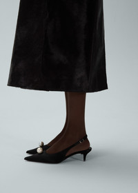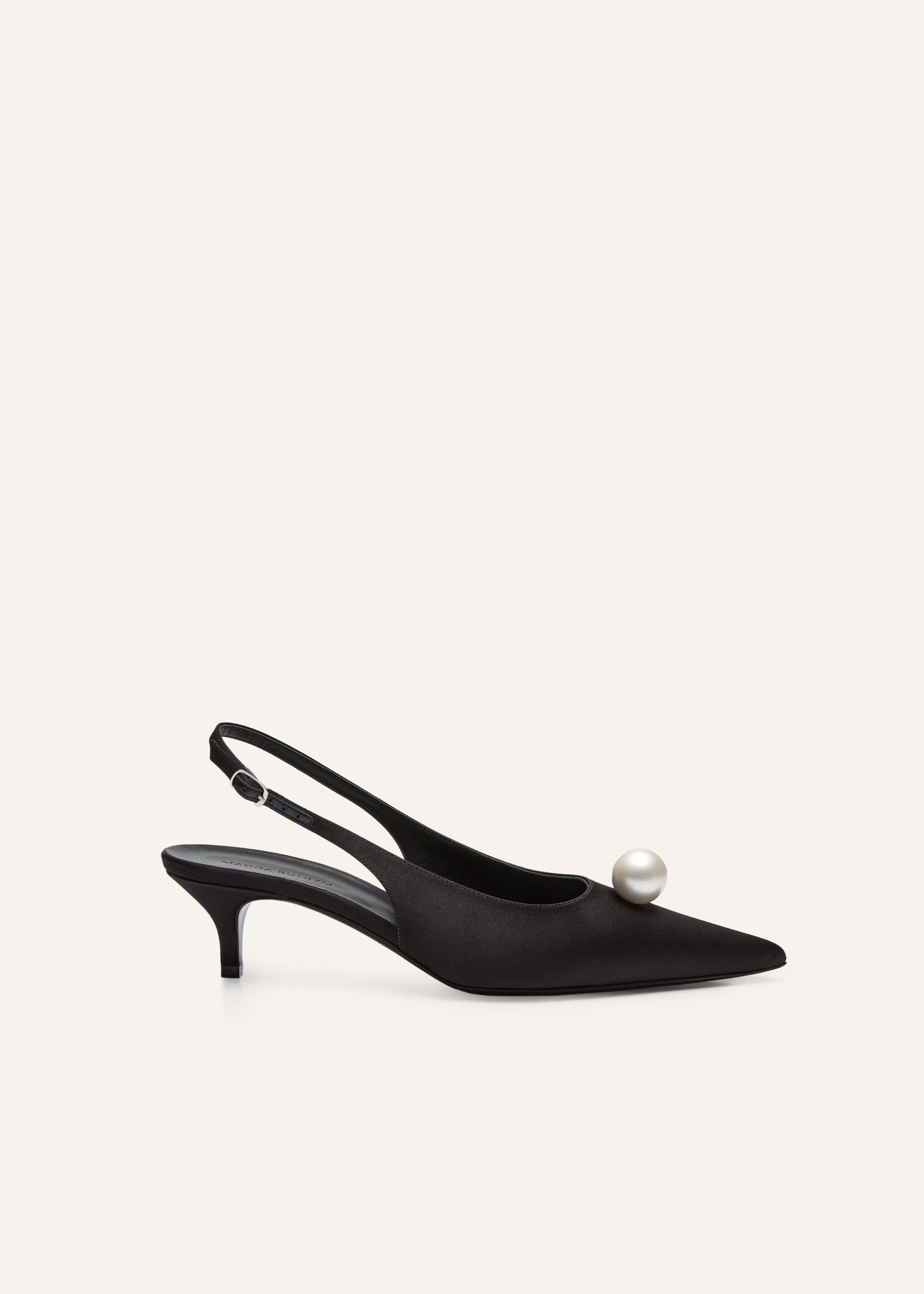 Classic pointed-toe slingback kitten heels with a pearl embellishment at the front. Set on a 45mm heel. Made in Italy. Details ID: 521425 Upper: Satin (100% Silk). Insole, Sole: 100% Calf Leather Sizing This piece fits true to size. We recommend you get your regular size.