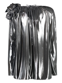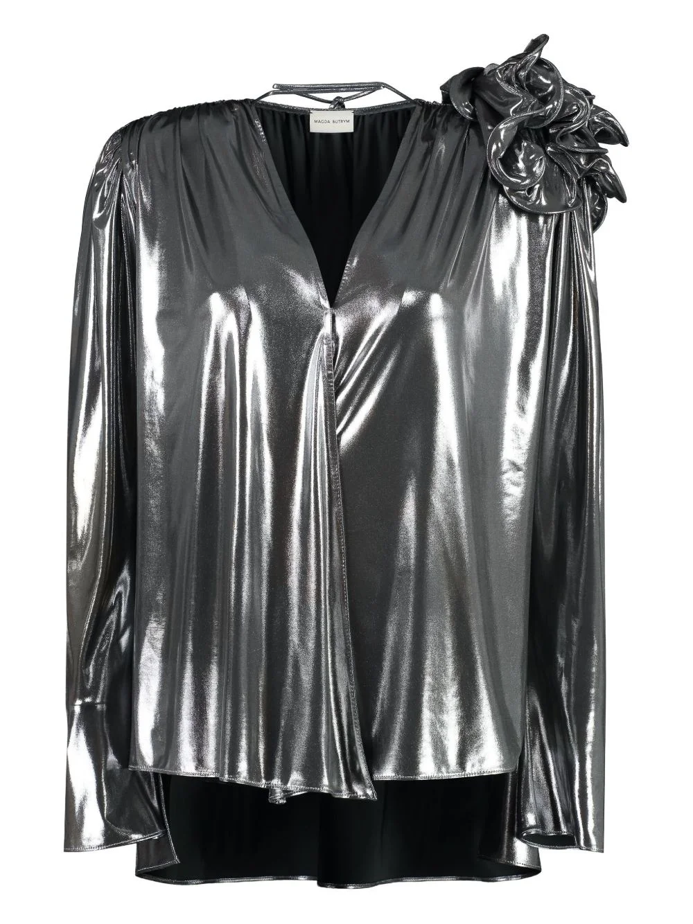 v-neck blouse Highlights - Silver-tone - Gathered detail - Long sleeves - V-neck - Floral applique Imported Composition Polyester 95%, Elastane 5%