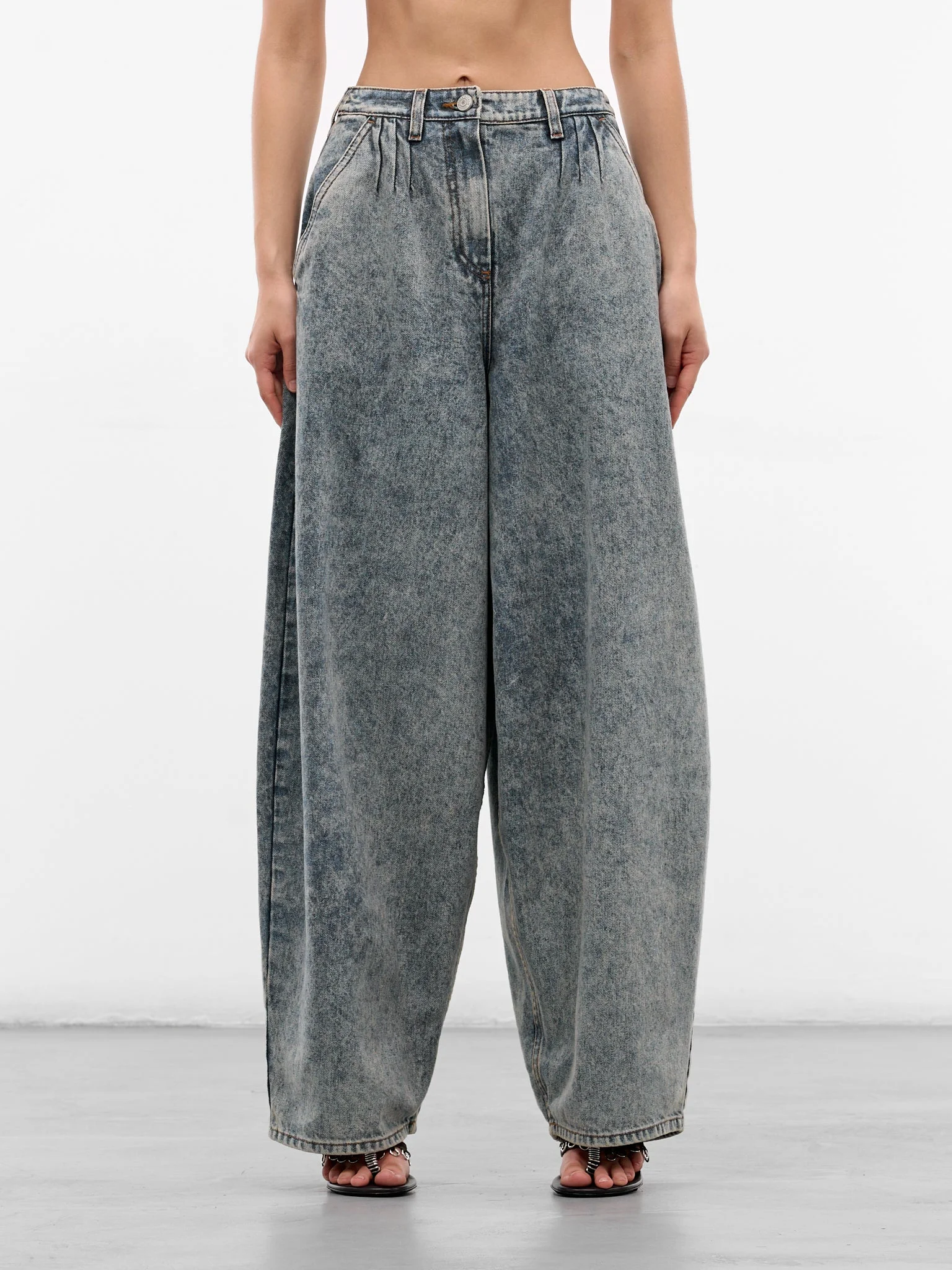 Denim jeans in blue with vintage fading in structured denim construction and a pleated high-waist silhouette. Featuring: • Baggy fit • Vintage treatment and fading • High waist • Belt loops with logo patch • Front button and zip fly • Pleated front • Inset pockets • Back welt pockets • Tapered wide leg • Made in Poland • 100% Cotton • French sizing Model is 5'8.5" wearing size 34. Bust: 32” Waist: 24” Hips: 34”