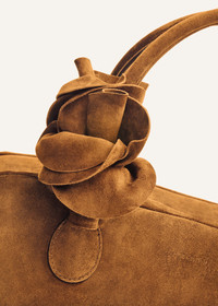 Introducing the Brigitte handbag. Inspired by the nostalgia of 90's while deeply rooted in Magda's family heritage. Its elegant silhouette, the roomy interior, two top handles and top zipper have been thoughtfully crafted in Italy. Adding a touch of on-brand dreaminess is the leather flower embellishment. Meticulously arranged and fixed onto the bag's handle. For an ideal finish curl the flower petals outward for a blooming rose effect on your bag. Details ID: 902925 Exterior: 100% Calf Leather. Interior: 44% Cotton 44% Linen 12% Polycarbonate Sizing Approximate measurements: 19cm height, 33cm width, 13 cm depth (at bottom).