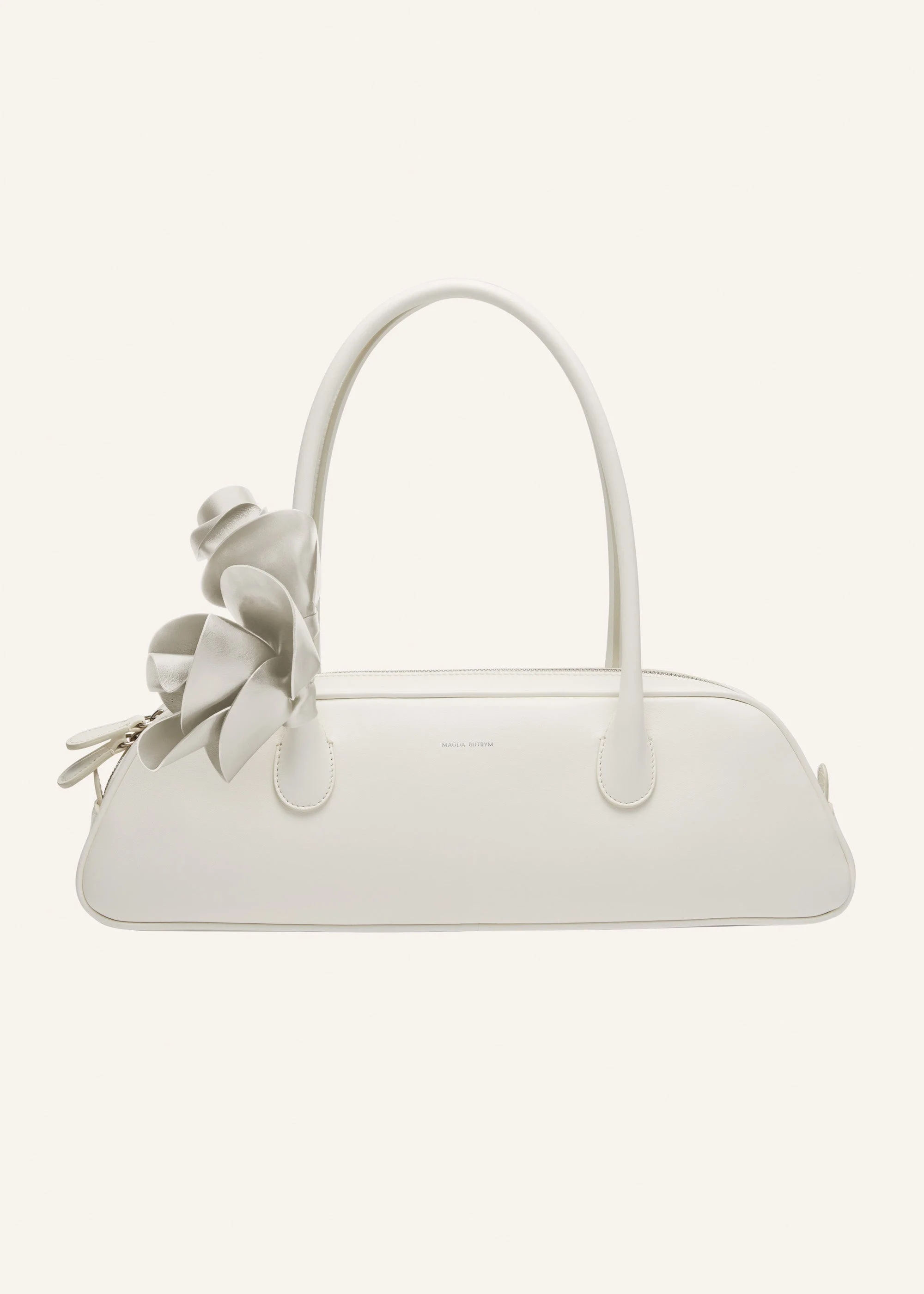 The Brigitte bag gets a new trapeze shape. Inspired by the nostalgia of 90's while deeply rooted in Magda's family heritage. Its elegant silhouette, the roomy interior, two top handles and top zipper have been thoughtfully crafted in Italy. Adding a touch of on-brand dreaminess is the leather flower embellishment. Meticulously arranged and fixed onto the bag's handle. For an ideal finish curl the flower petals outward for a blooming rose effect on your bag. Details ID: 704524 Exterior: 100% Calf Leather. Interior: 100% Calf Leahter Sizing Approximate measurements: 10cm height, 35cm width, 8 cm depth (at bottom), 17cm handle drop.