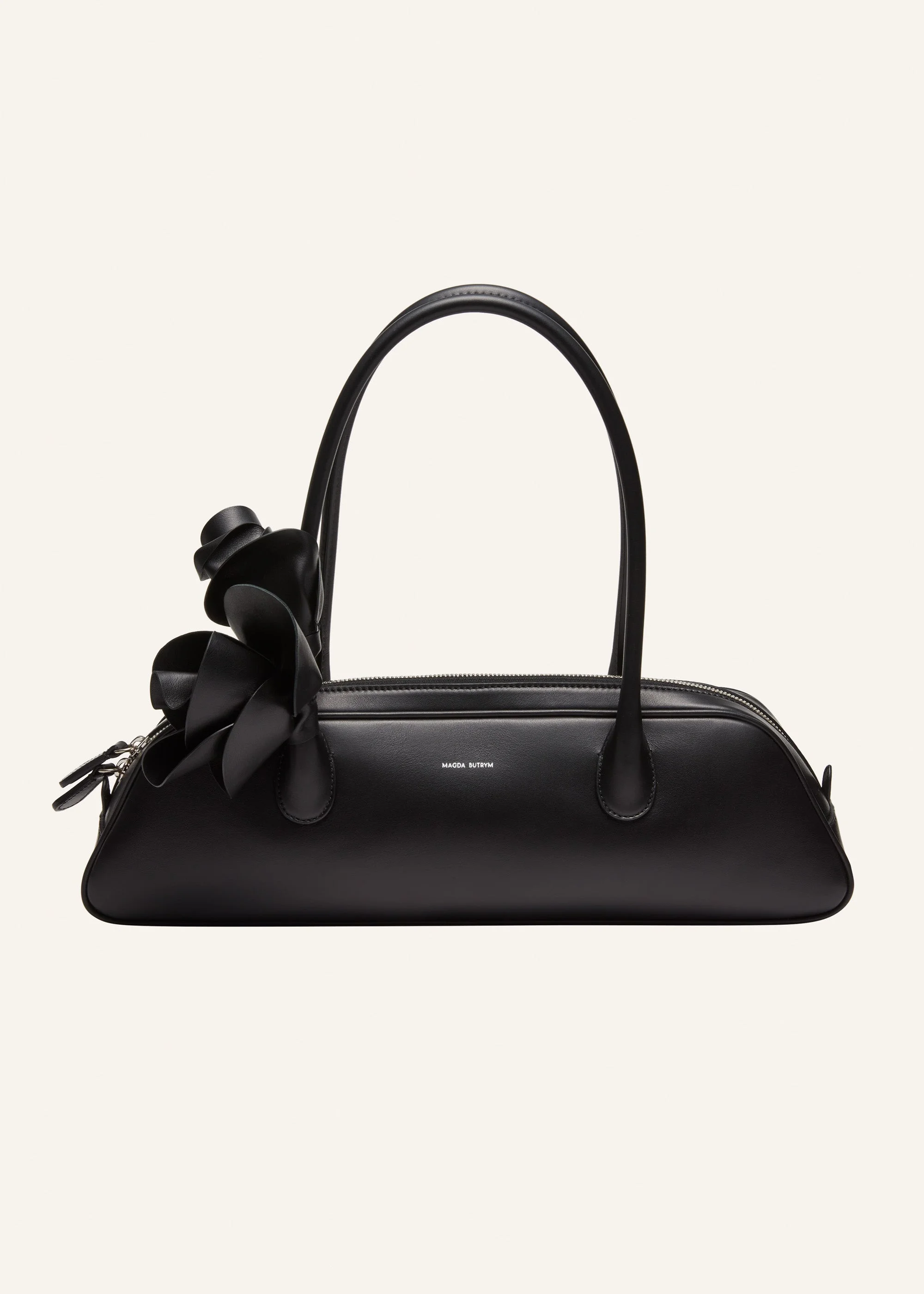 The Brigitte bag gets a new trapeze shape. Inspired by the nostalgia of 90's while deeply rooted in Magda's family heritage. Its elegant silhouette, the roomy interior, two top handles and top zipper have been thoughtfully crafted in Italy. Adding a touch of on-brand dreaminess is the leather flower embellishment. Meticulously arranged and fixed onto the bag's handle. For an ideal finish curl the flower petals outward for a blooming rose effect on your bag. Details ID: 701524 Exterior: 100% Calf Leather. Interior: 100% Calf Leahter Sizing Approximate measurements: 10cm height, 35cm width, 8 cm depth (at bottom), 17cm handle drop.