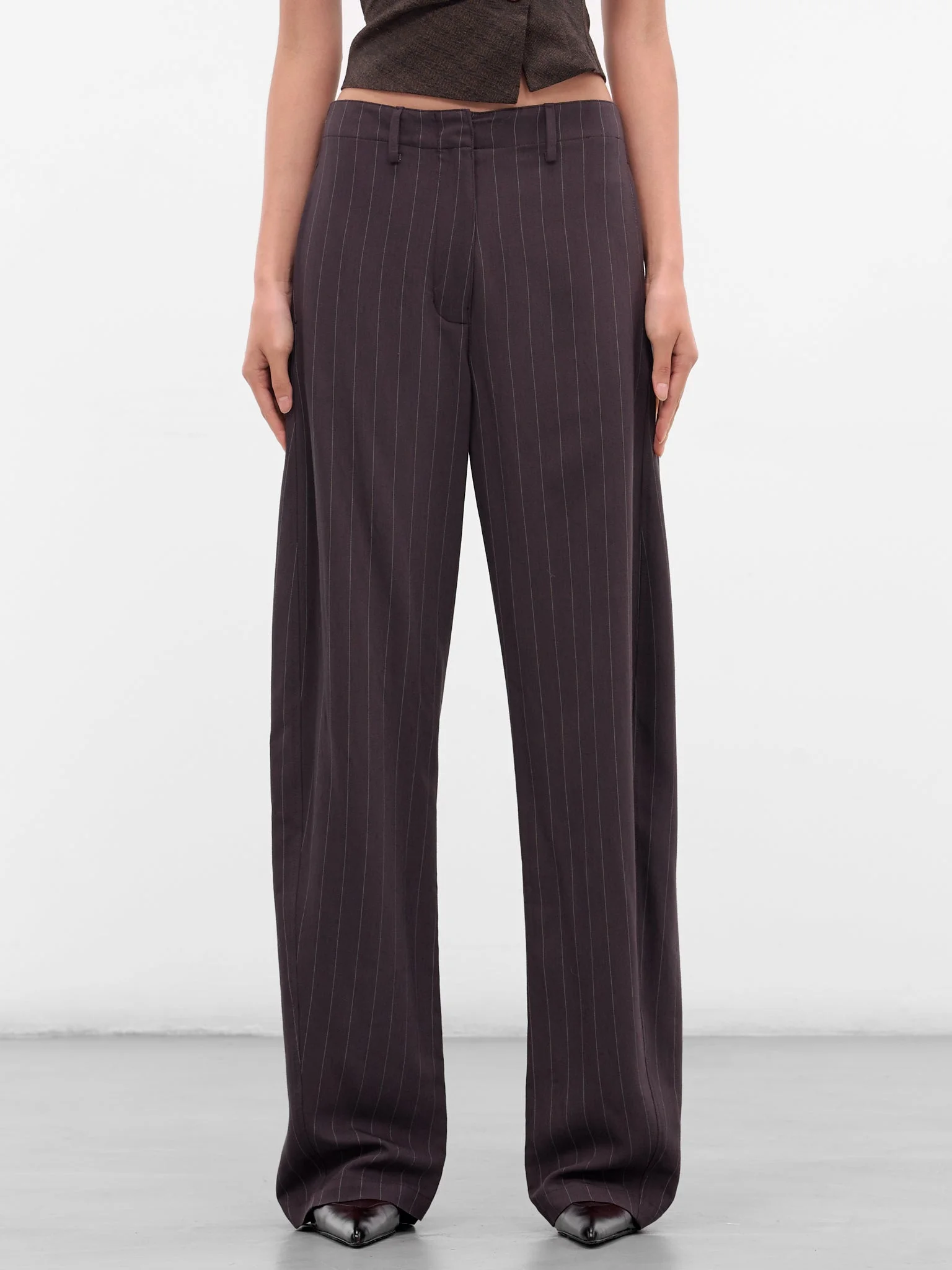 Featuring: • Relaxed tailoring fit • Wool-polyamide construction • Brown color with pinstripe pattern • Dropped waistline with front zip fly closure • Wide-leg silhouette with side seams shifted toward the front • Front welt pockets and single-button back pockets • Rear belt loops shaped into an “M” motif • Shell: 97% Wool 3% Polyamide | Lining: 100% Silk • French sizing Model is 5'10" wearing size 34. Bust: 31” Waist: 22” Hips: 33”