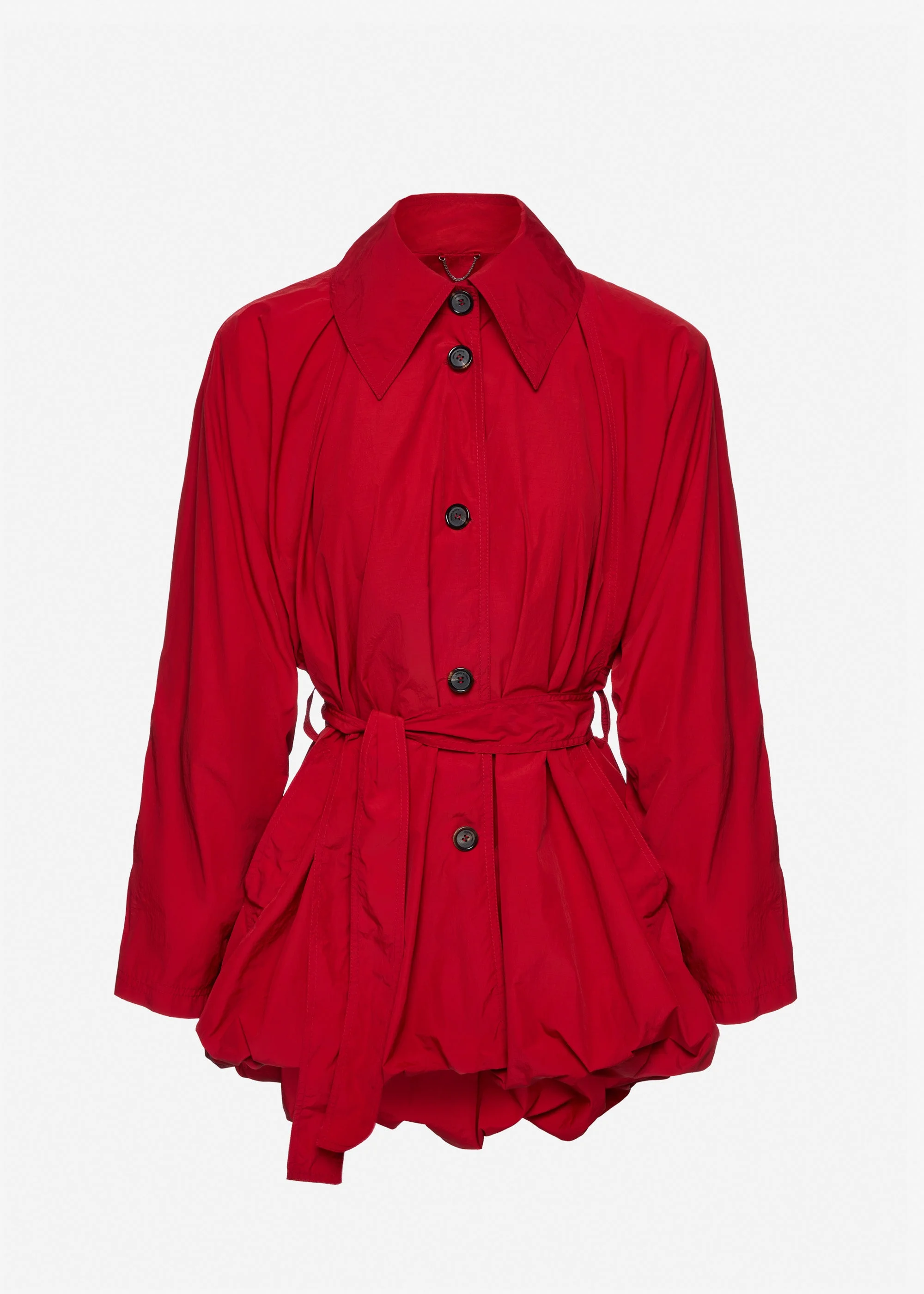 Cut to the hips, this jacket features a sculptural silhouette with a voluminous hemline shaped into a soft bubble effect. Designed with a stand collar, raglan sleeves, and two front welt pockets. The waist is cinched with a belt threaded through three loops and fastened with a metal buckle. Finished with a full silk lining and front button closure. Details ID: 281526 Shell 100% Polyamide. Lining 100% Silk. Sizing This piece has a regular fit. Model is wearing a size 34.