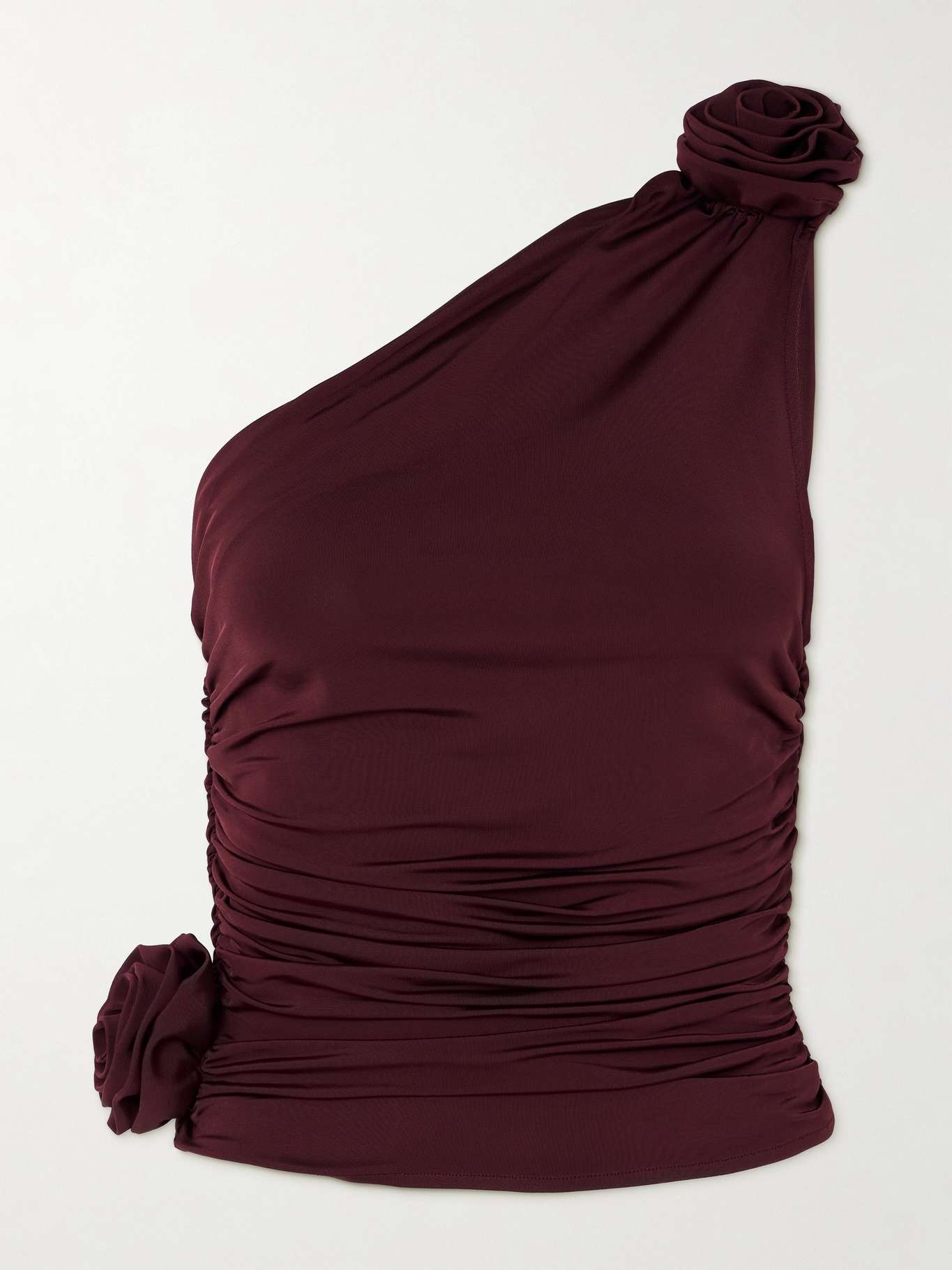 One-shoulder floral-appliquéd ruched satin-jersey top Burgundy
