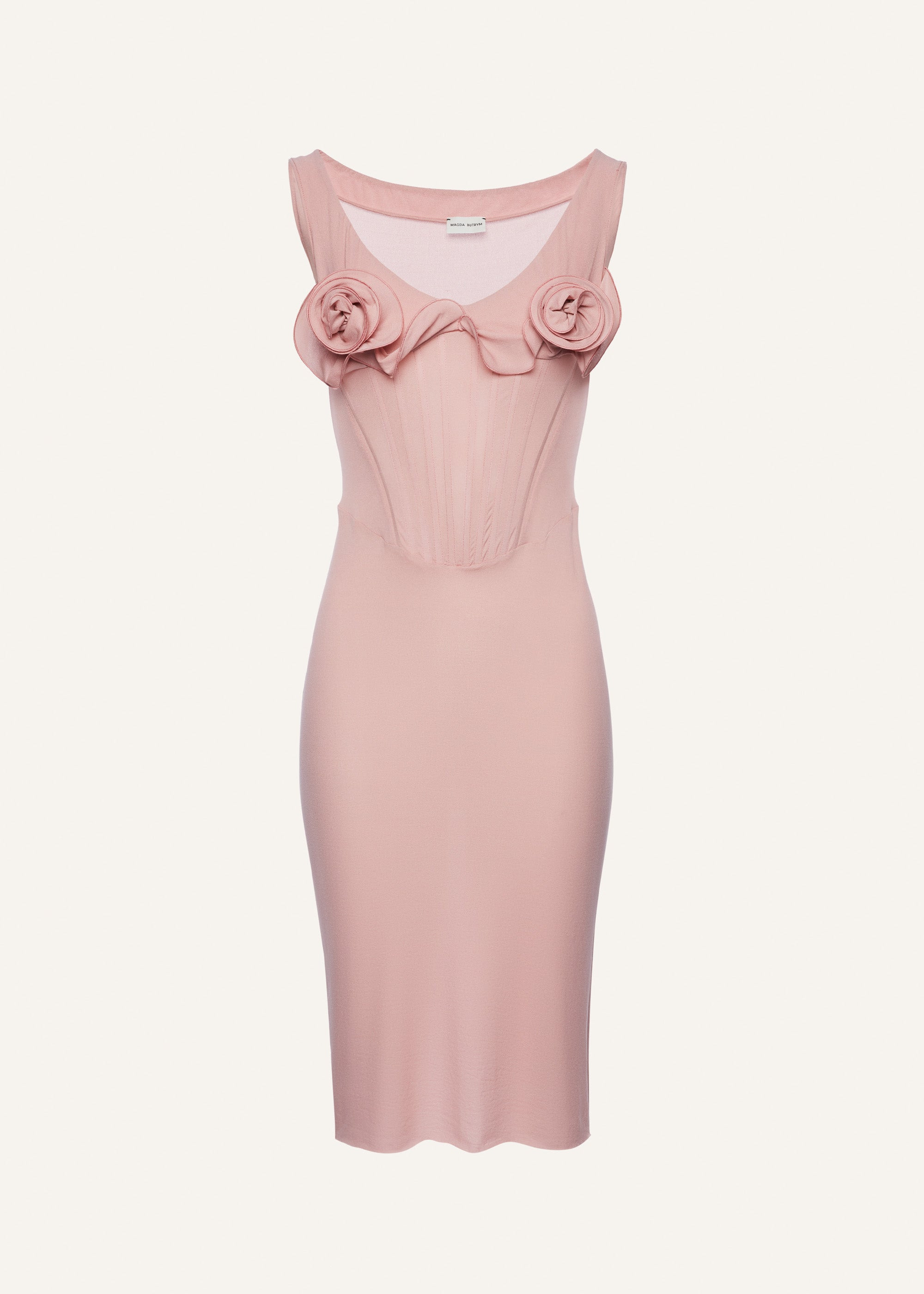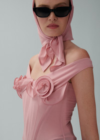 Pink bustier midi dress featuring floral appliques and corset detailing, complete with matching briefs. Details ID: 277425 Shell 85% Silk 15% Elastane. Body 100% Cotton. Sizing This piece fits true to size. We recommend you get your regular size. Model is 180 cm and is wearing a size 34.