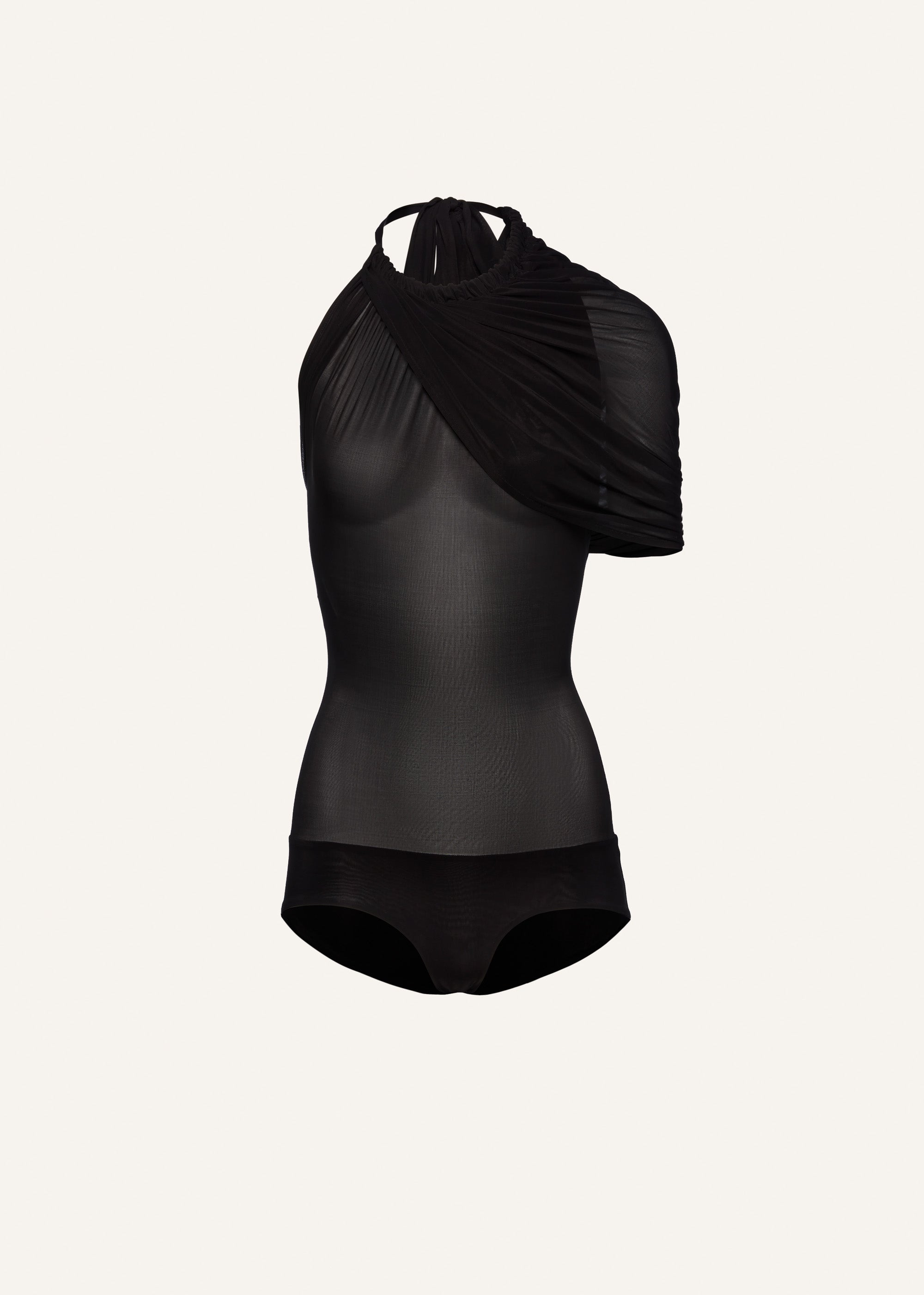 A sheer stretch silk halter bodysuit featuring a tie neck and open back, accentuated by an asymmetrical cape draping gracefully over one shoulder. Details ID: 244425 Shell 92% Cupro 8% Elastane. Sizing This piece fits true to size. We recommend you get your regular size. Model is 180 cm and is wearing a size 34.