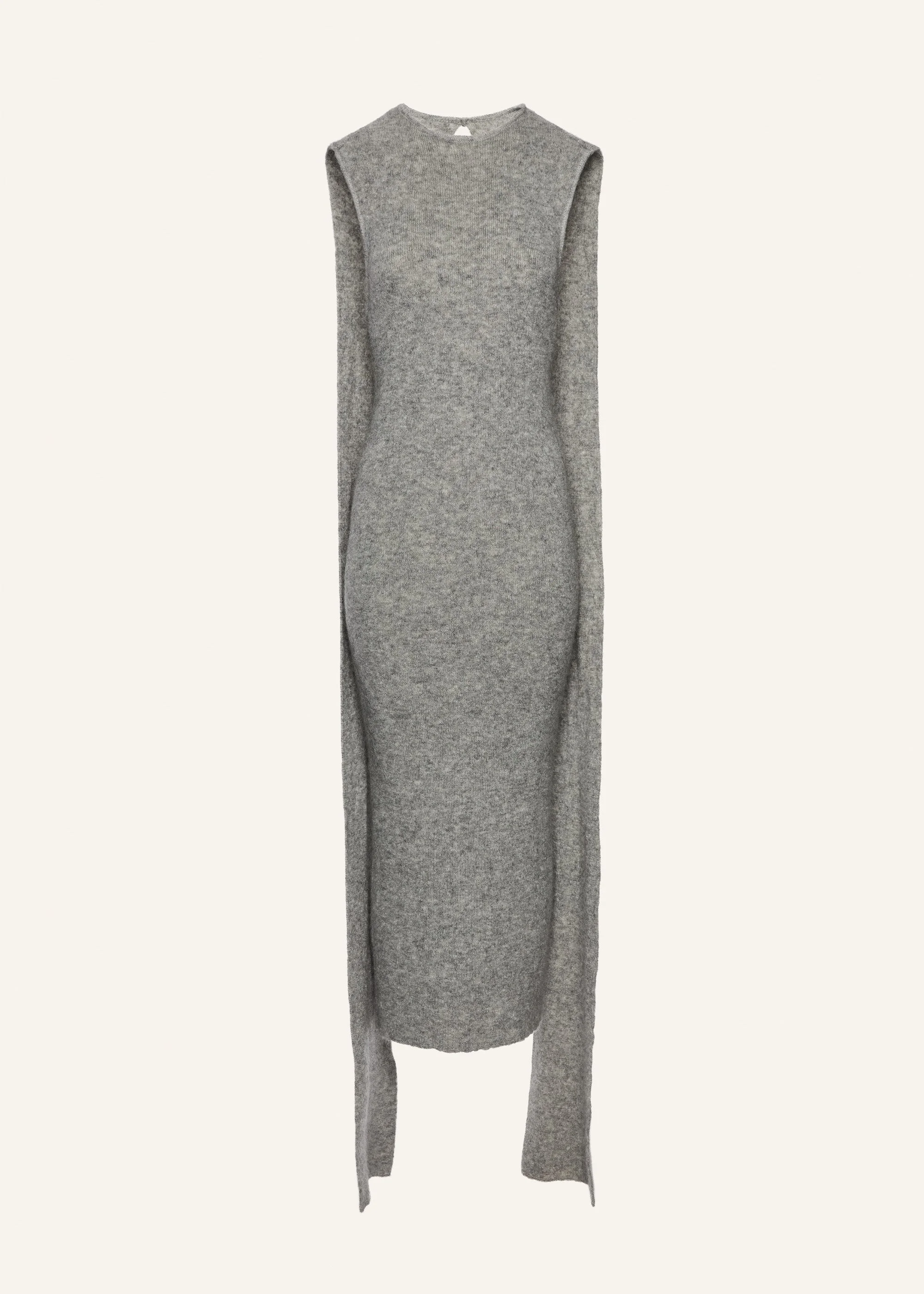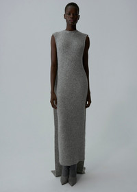 A statement silhouette rendered in soft brushed mohair, this sleeveless dress features a clean, columnar shape that hugs the body. Dramatic extended side panels cascade from the shoulders, adding fluidity and movement. Finished with a minimalist back keyhole closure, it merges sculpture and softness in one piece. Details ID: 319925 Shell 65% Mohair 33% Polyamide 2% Wool. Sizing This piece fits true to size. We recommend you get your regular size. Model is 177 cm and is wearing a size 34.
