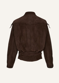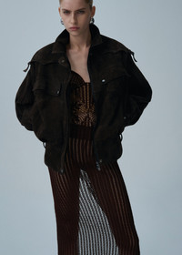 This cargo jacket is made from rich, soft brown suede, offering a luxurious take on utilitarian style. The jacket features large flap pockets, snap closures, and adjustable drawstring details on the sleeves and waist for a customizable fit. It's a versatile layering piece, perfect for adding a statement to any outfit, whether casual or dressed up. Details ID: 516525 Shell 100% Sheep Leather. Lining 100% Viscose. Sizing This piece fits true to size. We recommend you get your regular size. Model is 182cm and is wearing a size 34.