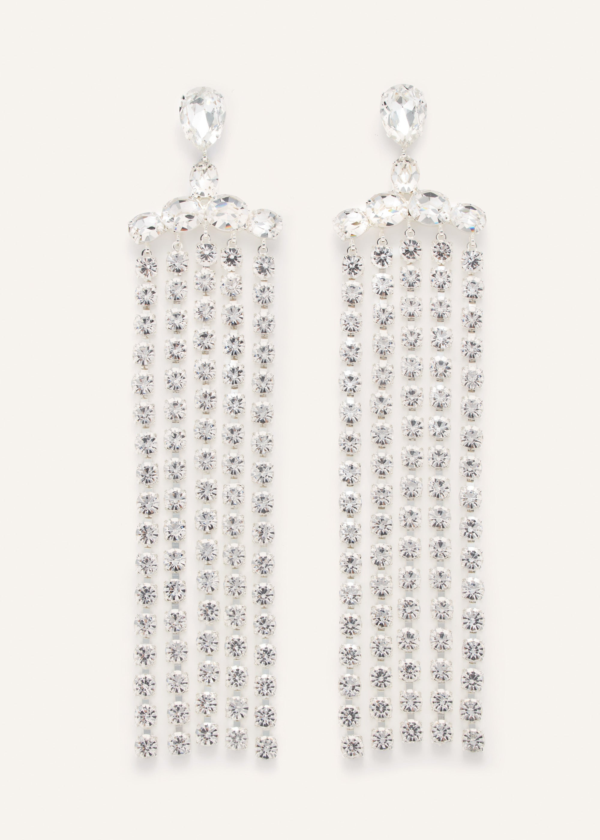 Silver crystal earrings with a cascading design of teardrop and round crystals for dramatic sparkle. Details ID: 701425 Hypoallergenic Plated Brass. Crystals. Sizing Approximate measurements: 18,5cm drop, 4cm width