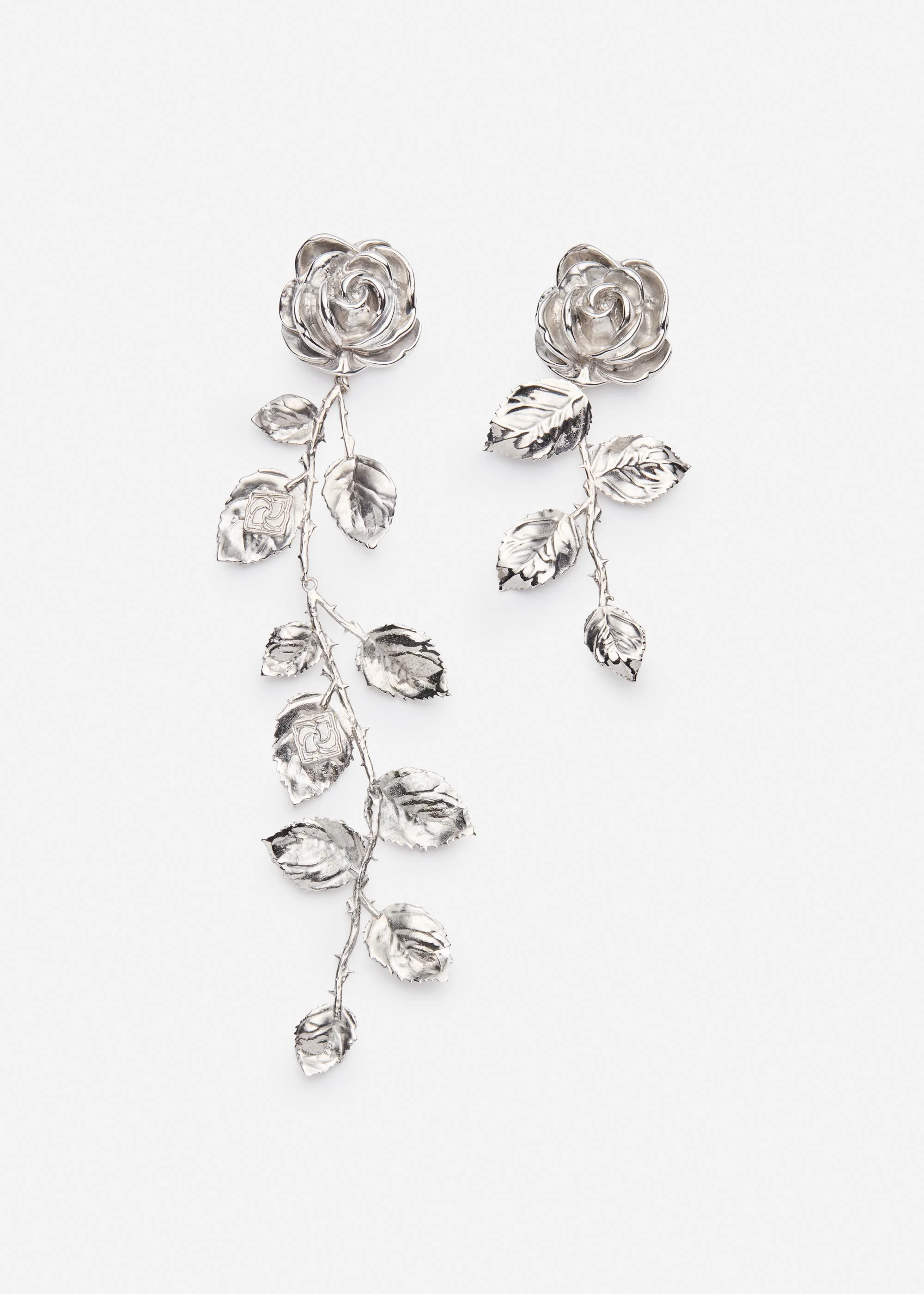 These earrings feature roses with cascading leaves in a fluid, vine-like formation. Their asymmetrical length and intricate detailing create a romantic silhouette that embodies Magda Butrym’s signature blend of femininity and artistry. For pierced ears. Details ID: 701426 Hypoallergenic Plated Brass. Sizing Approximate measurements: 10 cm drop, rose diameter is 2,5 cm.
